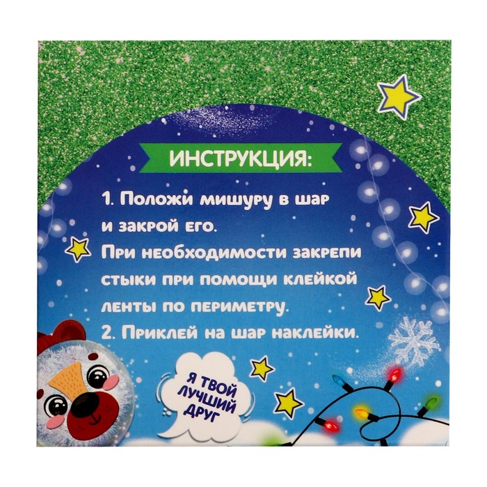 Габариты: 8 x 8 x 5 Страна: Китай В боксе: 210 набор Состав: Бумага, металл, пластик, текстиль Материалы: бумага, металл, пластик, текстиль Фасовка: по 1 набор Индивидуальная упаковка: Цветная картонная коробка Габариты товара: 8 см × 8 см × 5,3 см Сертификат: Не подлежит сертификации Набор: Да Цвет: Прозрачный Для кого: Унисекс Диаметр, см: 8 Возраст: От 3 лет Диаметр шара, см: 8 Рисунок: Да Символ года: Нет Тематика праздника: Новый год Материал: Пластик Для создания: Ёлочная игрушка Составляющие набора: Товары для творчества Возраст: От 3 лет Возраст: Для детей Создайте с малышом волшебное украшение для ёлочки. Положите мишуру в шар и закройте его. При необходимости закрепите стыки при помощи клейкой ленты по периметру. Приклейте радостную мордашку на шар. Пара мгновений, и оригинальный ёлочный шар у вас у руках! Готовая игрушка станет чудесным дополнением новогодней атмосферы или порадует близкого человека. Комплектация