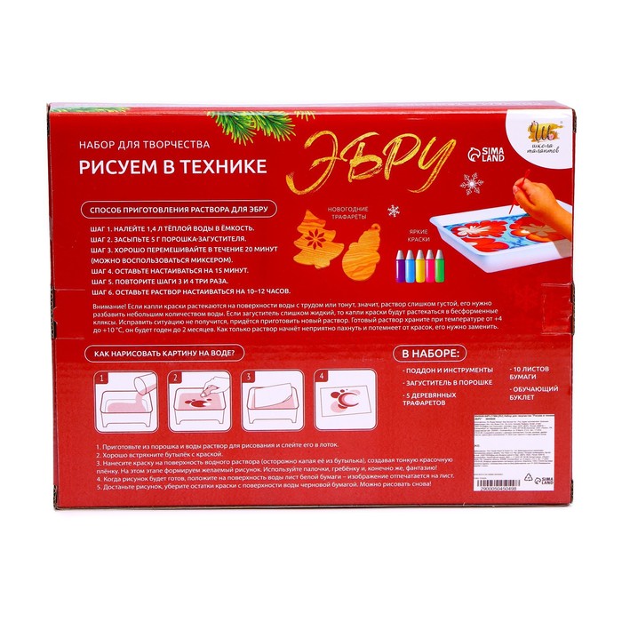 Габариты: 26,5 x 20,5 x 4 Страна: Китай В боксе: 36 набор Состав: Дерево, пластик, краска, полимер Материалы: дерево, пластик, краска, полимер Фасовка: по 1 набор Индивидуальная упаковка: Цветная картонная коробка Сертификат: Не подлежит сертификации Набор: Да Количество цветов: 5 Возраст: От 7 лет Вид упаковки: Коробка картонная Символ года: Нет Тематика праздника: Новый год Вид: Эбру Для создания: Открытки, Ёлочная игрушка, Значок Составляющие набора: Товары для творчества Темпер. ограничение НЕ НИЖЕ ℃: -25 Темпер. ограничение НЕ ВЫШЕ ℃: +25 Температурное ограничение транспортировки: Нет Комплектация набора: С красками Эбру — это древняя восточная техника живописи, прекрасный инструмент для развития воображения, моторики и творческих способностей. Получившуюся картину можно перенести не только на бумагу, но и на дерево. В комплект входит: