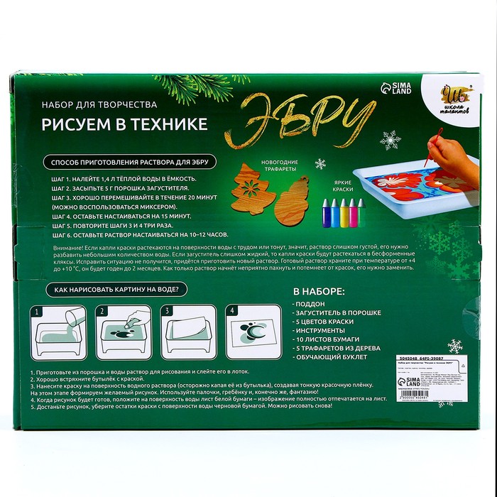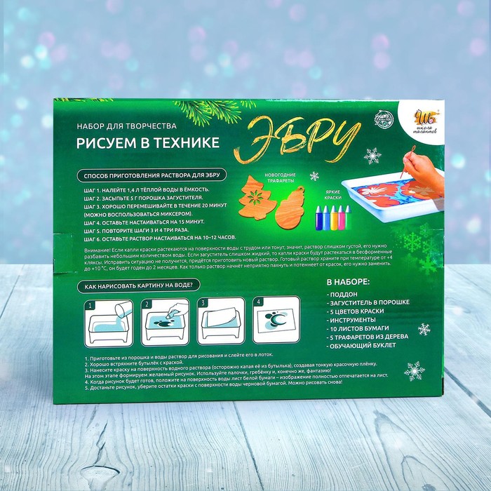 Габариты: 26 x 20 x 4 Страна: Китай В боксе: 36 набор Состав: Дерево, пластик, краска, полимер Материалы: дерево, пластик, краска, полимер Фасовка: по 1 набор Индивидуальная упаковка: Цветная картонная коробка Сертификат: Не подлежит сертификации Набор: Да Количество цветов: 5 Возраст: От 7 лет Вид упаковки: Коробка картонная Символ года: Нет Тематика праздника: Новый год Вид: Эбру Для создания: Открытки, Значок, Ёлочная игрушка Составляющие набора: Товары для творчества Темпер. ограничение НЕ НИЖЕ ℃: -25 Темпер. ограничение НЕ ВЫШЕ ℃: +25 Температурное ограничение транспортировки: Нет Комплектация набора: С красками Эбру — это древняя восточная техника живописи, прекрасный инструмент для развития воображения, моторики и творческих способностей. Получившуюся картину можно перенести не только на бумагу, но и на дерево. В комплект входит:
