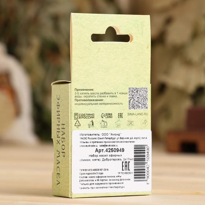 Производитель: Добропаровъ; Габариты: 3 x 6 x 7,5; Страна: Россия; В боксе: 18 набор; Состав: Масло, стекло; Материалы: масло, стекло; Фасовка: по 1 набор; Индивидуальная упаковка: Цветная картонная коробка; Сертификат: ЕАС; Набор: Да; Объём, мл: 17; Аромат: Мята, Лимон; Группа ароматов: Трава, Цитрусовые; Темпер. ограничение НЕ НИЖЕ ℃: 0; Фиксированная цена: Да