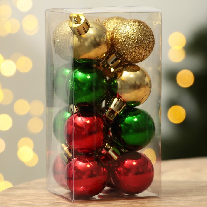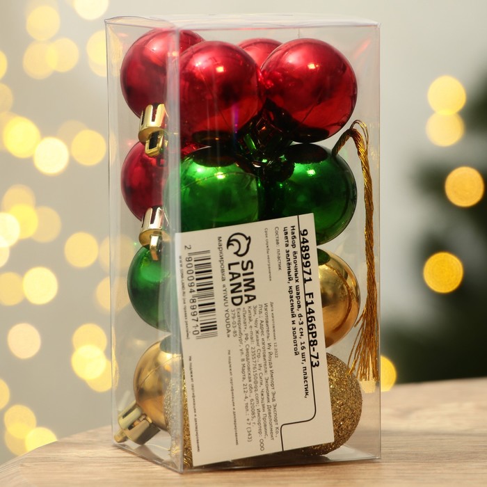 Габариты: 6 x 6 x 12 Страна: Китай В боксе: 168 набор Состав: Пластик Материалы: пластик Фасовка: по 1 набор Индивидуальная упаковка: PVC Габариты товара: 6 см × 6 см × 12 см Сертификат: Не подлежит сертификации Набор: Да Цвет: Золотистый, Красный, Зелёный Высота, см: 12 Диаметр шара, см: 3 В наборе, шт.: 16 Символ года: Нет Материал: Пластик Стиль: Фьюжн Комментарии к товару
