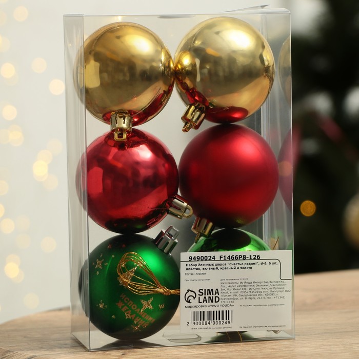 Габариты: 6 x 12 x 18 Страна: Китай В боксе: 84 набор Состав: Пластик Материалы: пластик Фасовка: по 1 набор Индивидуальная упаковка: PVC Габариты товара: 12 см × 6 см × 18 см Сертификат: Не подлежит сертификации Набор: Да Цвет: Золотистый, Красный, Зелёный Высота, см: 18 В наборе, шт.: 6 Диаметр шара, см: 6 Символ года: Нет Материал: Пластик Стиль: Фьюжн Комментарии к товару