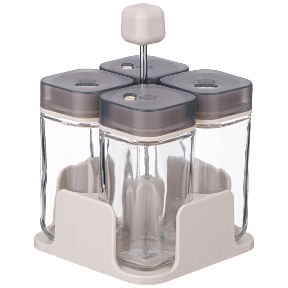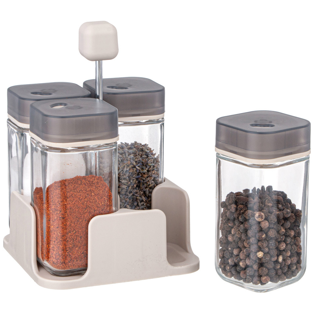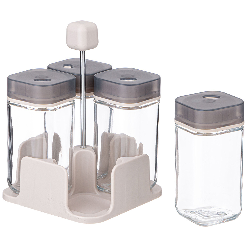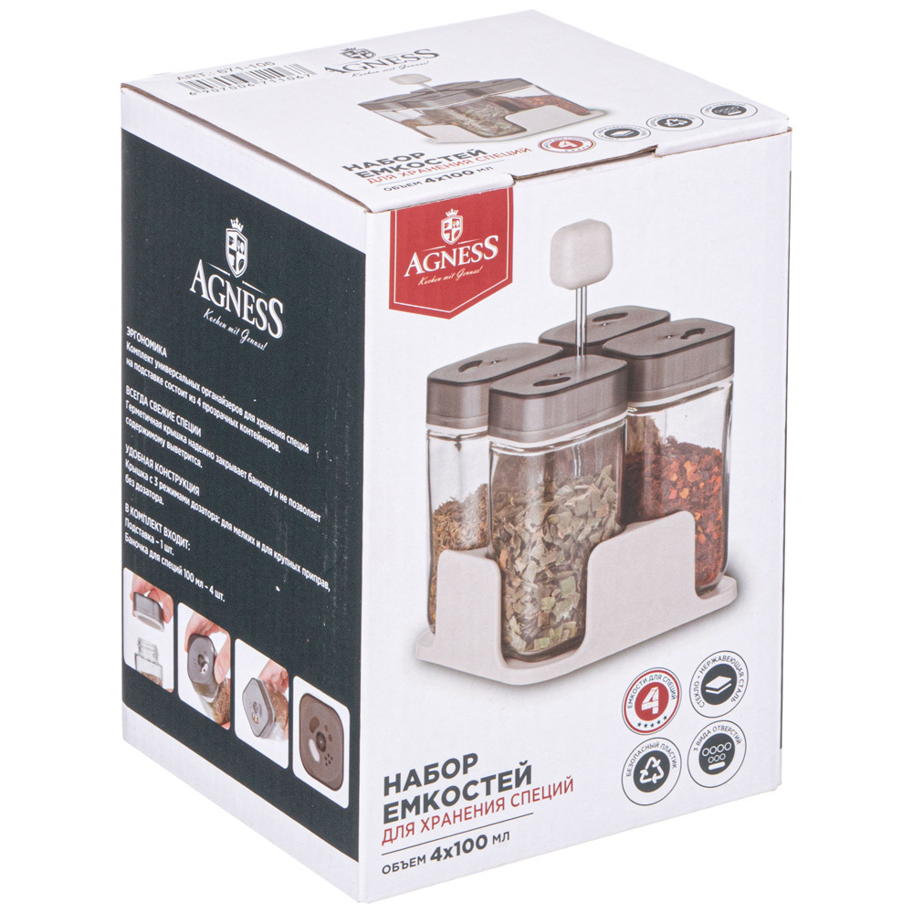 НАБОР ЕМКОСТЕЙ ДЛЯ СПЕЦИЙ 4ШТ 100МЛ НА ПОДСТАВКЕ AGNESS включает в себя стеклянные емкости, предназначенные специально для удобного и долговременного хранения специй на кухне , и стильную подставку.Этот набор является не только полезным, но и стильным дополнением кухонного интерьера. Все баночки для специй выполнены из стекла – прочного и надежного материала для хранения пищевых продуктов. Они герметично закрываются, предотвращая попадание влаги и посторонних запахов. Это отличное решение для организации кухонного хранения и подарок для тех, кто любит готовить и экспериментировать с различными вкусовыми сочетаниями.