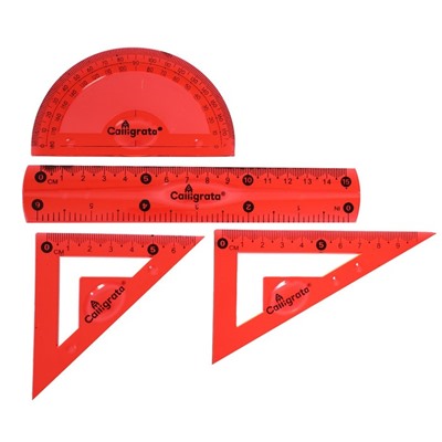 В комплекте: линейка 15 см, 2 треугольника, транспортир.