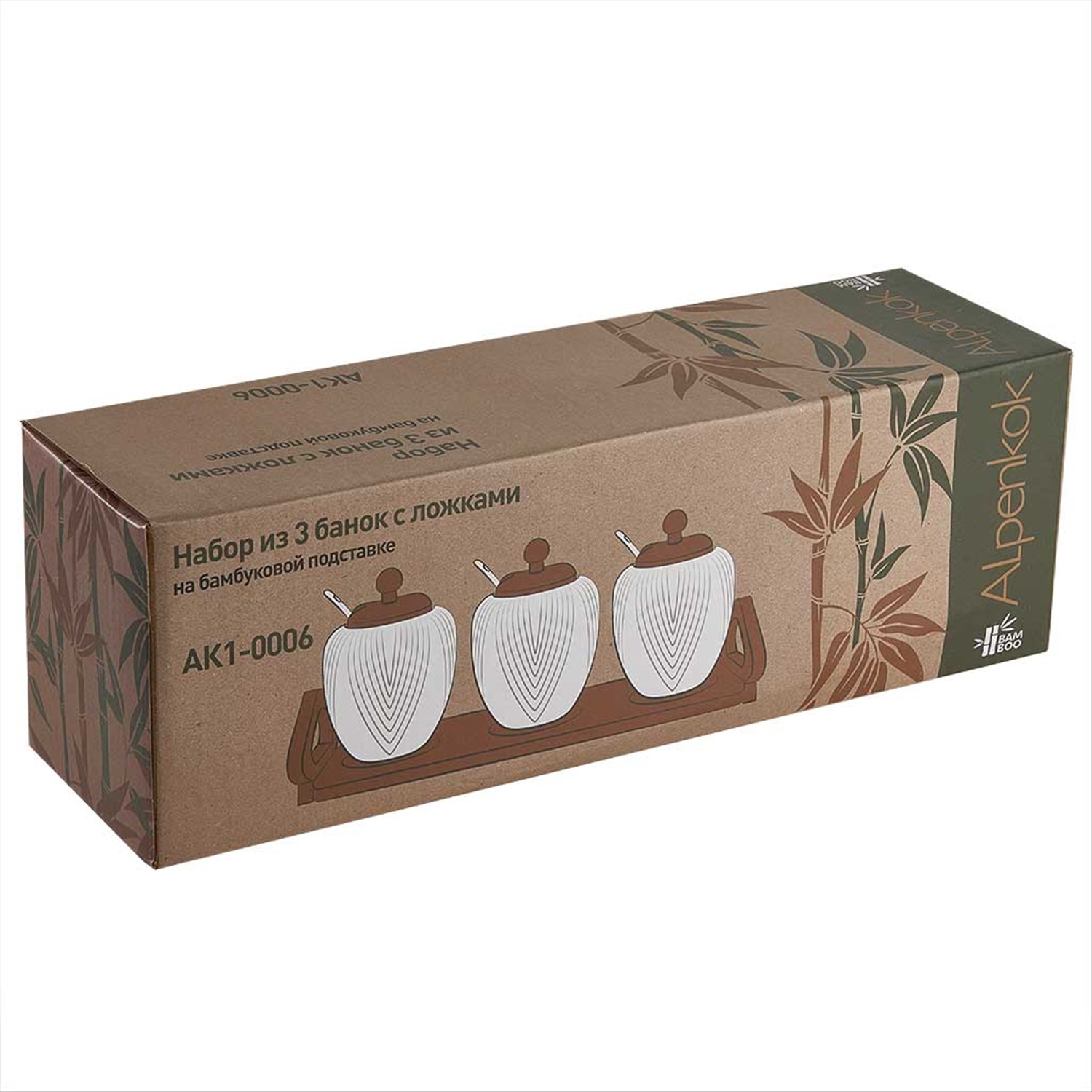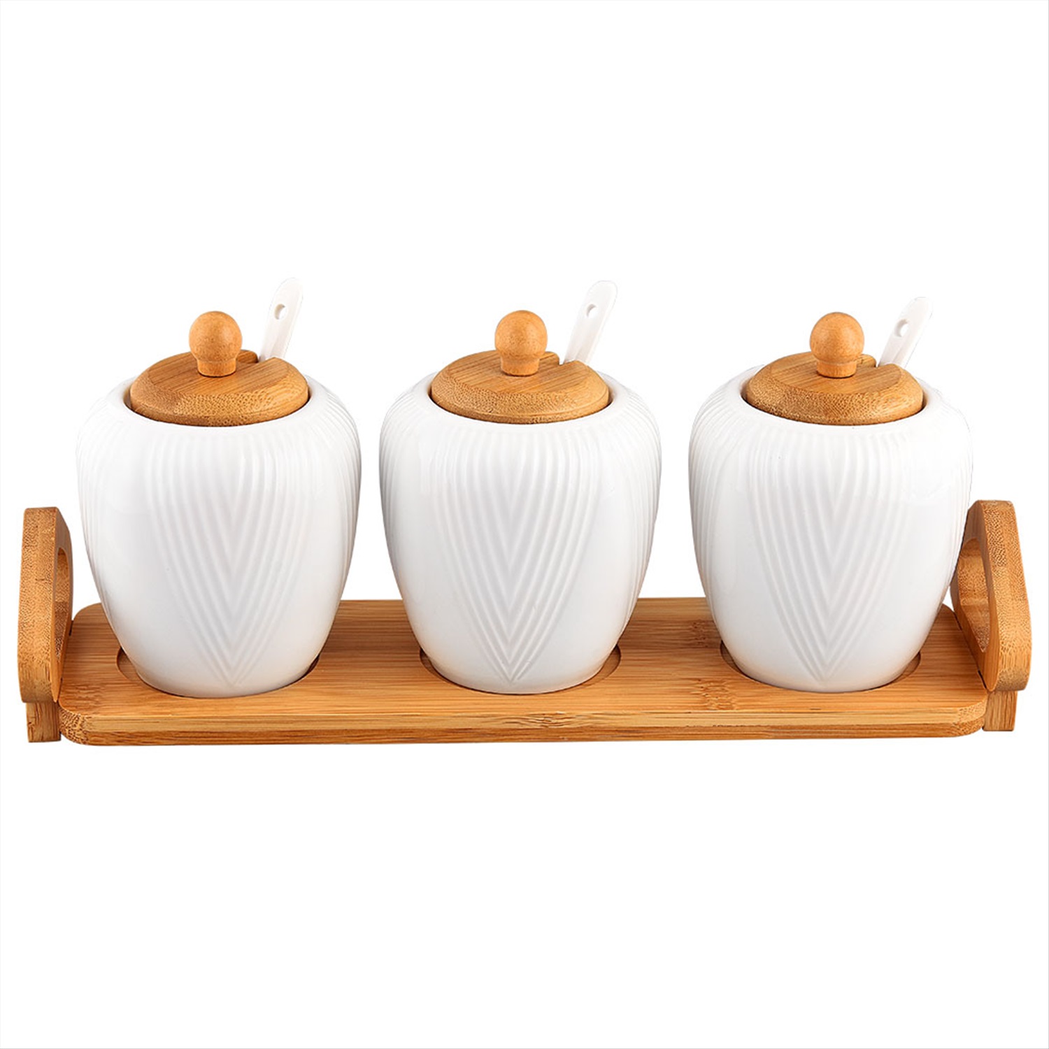 * Набор фарфоровых банок с бамбуковыми крышками и фарфоровыми ложками на бамбуковой подставке