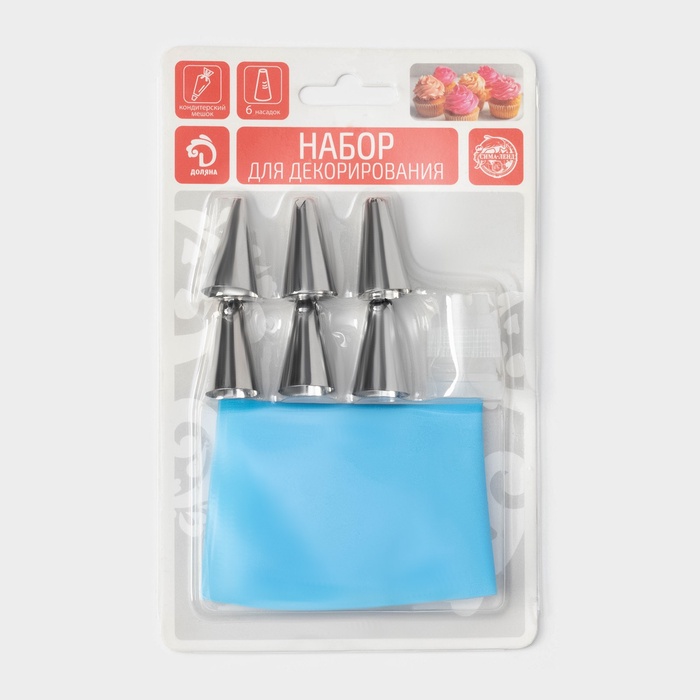 Производитель: Доляна; Габариты: 19 x 12 x 2,5; Страна: Китай; В боксе: 240 набор; Состав: Нержавеющая сталь, пластик; Материалы: нержавеющая сталь, пластик; Фасовка: по 1 набор; Индивидуальная упаковка: Блистер; Габариты товара: 30 см × 16,5 см × 1,7 см; Сертификат: СТР; Набор: Да; Цвет: МИКС; Количество насадок: 6; В наборе, шт.: 8; Длина мешка, см: 26; Комплектация: Насадки, Адаптер, Мешок кондитерский; Материал насадок: Нержавеющая сталь; Материал: EVA