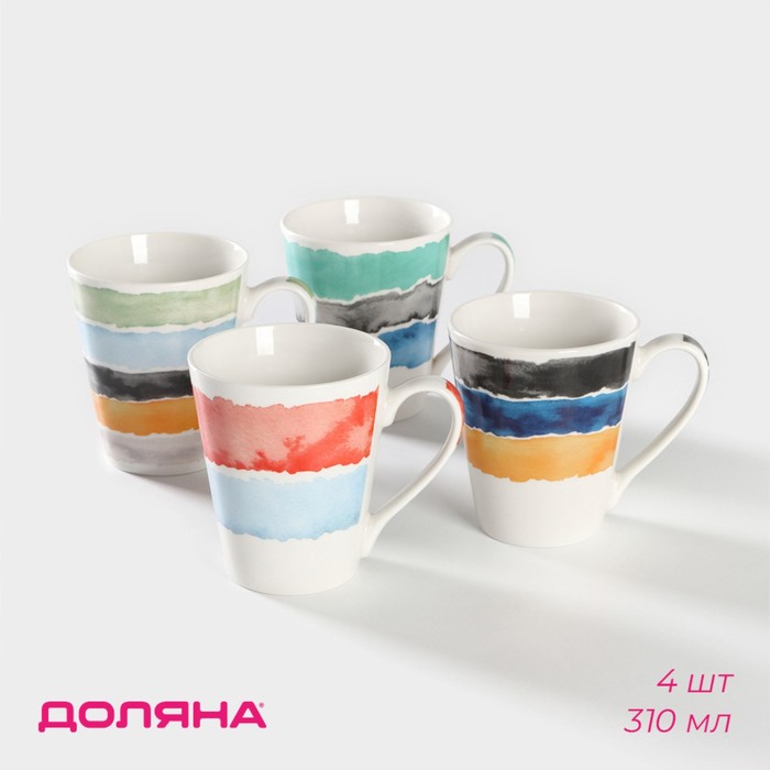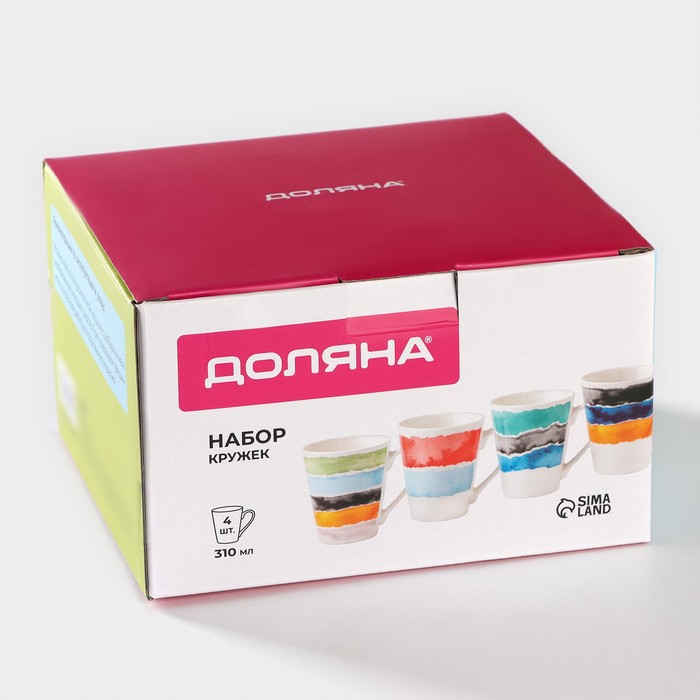 Производитель: Доляна; Габариты: 18,5 x 17,5 x 11; Страна: Китай; В боксе: 12 набор; Состав: Новый костяной фарфор; Материалы: новый костяной фарфор; Фасовка: по 1 набор; Индивидуальная упаковка: Цветная картонная коробка; Габариты товара: 12 см × 9 см × 10 см; Сертификат: СТР; Набор: Да; Цвет: Разноцветный; Высота, см: 10; В наборе, шт.: 4; Количество персон: 4; Объём, мл: 340; Тематика: Полоски, полоса; Рисунок: Да; Материал: Фарфор (Новый костяной фарфор); Дополнительный аксессуар: Без аксессуаров; Индивидуальная упаковка: Да; Можно мыть в посудомоечной машине: Да; Можно использовать в СВЧ-печи: Да; Текстура: Гладкая; Особенности: Без особенностей; Матовая поверхность: Нет