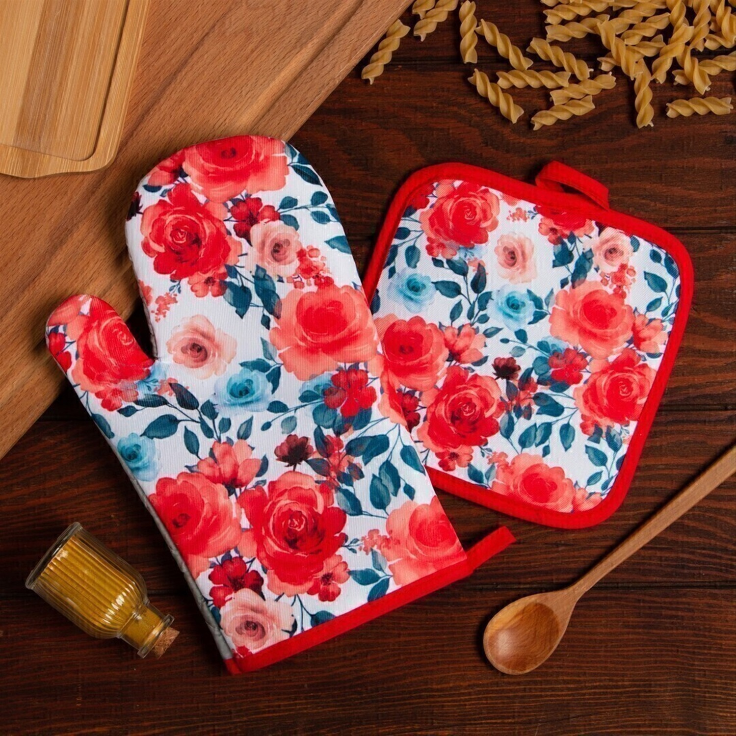 Набор кухонный 2 предмета (прихватка+рукавица) Доляна<9241970 Розы, прихватка 17*17+рукавица 25*16 >
