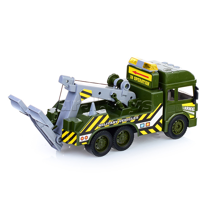 В наборе: - танк (26х10х8.5 см.) - манипулятор с инерционным механизмом движения (31х10х14 см.) Танк передвигается на колёсах. Башню танка можно поворачивать на 360 градусов. На манипуляторе можно наматывать и разматывать лебёдку. На крыше манипулятора 3 кнопки (звук мотора, звук работы манипулятора, звук заднего хода, мигание лампочки) Свет и звук работают от 2-х батареек "АА" (не входят в комплект) Материал: пластик. Соответствует требованиям безопасности продукции. Для детей от 3-х лет.