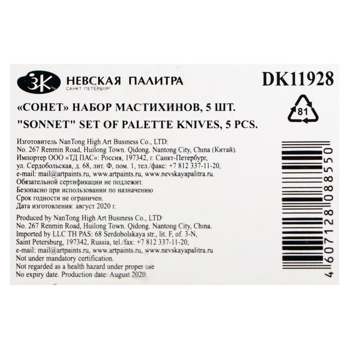 Производитель: Завод художественных красок «Невская палитра»; Габариты: 29 x 13,5 x 2; Артикул поставщика: DK11928; Страна: Китай; В боксе: 20 набор; Состав: Дерево, металл; Материалы: дерево, металл; Фасовка: по 1 набор; Индивидуальная упаковка: Блистер; Сертификат: Не подлежит сертификации; Набор: Да; Европодвес: Да; В наборе, шт.: 5; Вид упаковки: Блистер; Материал: Металл; Вид: Мастихин; Штрихкод на единице товара: Да