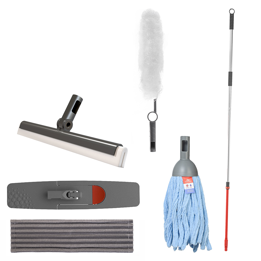Название товара: Набор Мультишвабра макси Артикул: NSNMM Материал: пластик, нержавеющая сталь, микрофибра Цвет: разноцветный Вес: 1800 гр Размеры в упаковке (ШхГхВ): 104,5 х 18 х 16,3 см Набор Мультишвабра макси от бренда Nordic Stream, включающий в себя телескопическую ручку, сменные насадки, подвижное основание, а также основание со скребком, поможет осуществить быструю и эффективную уборку, сбережет ваши силы и сэкономит время. Насадка из микрофибры быстро поглощает воду, пыль и жидкие загрязнения, не оставляя разводов и следов. Материал состоит на 88% из полиэстера и на 12% из полиамида и подходит для всех типов напольных покрытий: кафеля, керамогранита, ламината, дерева и линолеума. Насадка надежно крепится на флаундере, что препятствует ее соскальзыванию в процессе уборки. Подвижное основание для швабры, изменяющее уровень наклона швабры, с насадкой-тряпкой из микрофибры, которая выдерживает до 300 стирок при температуре до 60˚, – универсальный помощник для дома. Сменная насадка из жесткой микрофибры предназначена для интенсивной влажной уборки, эффективно справляется со сложными пятнами и твердой грязью, не царапая пол. Гибкая метелка для пыли с насадкой из микрофибры c разделенными волокнами притягивает пыль при помощи электростатической силы, собирает ее, не позволяя подниматься в воздух. Насадка из микрофибры Bucket обеспечит глубокую очистку любых напольных покрытий: ламината, линолеума, кафеля или паркета. Она идеально подходит для влажной уборки. Раздвижная ручка для швабры в комплекте с гибкой штангой облегчат уборку в труднодоступных местах. Телескопическая система позволяет раздвинуть штангу до 160 см. Выполненная из прочной нержавеющей стали ручка устойчива к механическим воздействиям и коррозии. В комплекте с гибкой штангой 40 см ручка эффективно справится с любыми загрязнениями даже в труднодоступных местах. Удобный механизм фиксирует две части в раздвижном положении, препятствуя самопроизвольному сложению. Аксессуар дополнен пластиковым колпачком с кольцом для подвешивания. Всего в наборе 6 предметов: - основание со скребком для пола; - насадка из жесткой микрофибры; - основание для швабры, 41 см; - основание с метелкой из микрофибры; - сменная насадка из микрофибры Bucket; - телескопическая ручка 160 см с гибкой штангой 40 см. Комментарии к товару