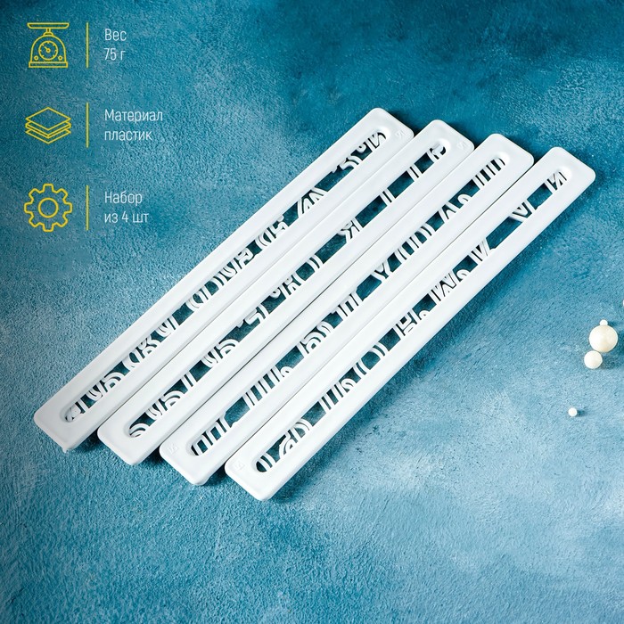 Производитель: Доляна; Габариты: 24 x 8,5 x 1; Страна: Китай; В боксе: 400 набор; В наборе: 4 набор; Состав: Пластик; Материалы: пластик; Фасовка: по 1 набор; Индивидуальная упаковка: Пакет; Габариты товара: 24 см × 15 см × 0,3 см; Сертификат: СТР; Набор: Да; Форма: Прямоугольная; В наборе, шт.: 4; Рисунок: Нет; Материал: Пластик; Разъёмная форма: Нет; Тематика: Цифры, буквы; Можно мыть в посудомоечной машине: Нет