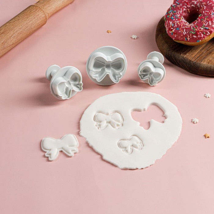 Этот набор включает плунжеры в форме трех бантиков разных размеров, что позволяет создавать многоуровневые композиции и украшать десерты различных форм и размеров.