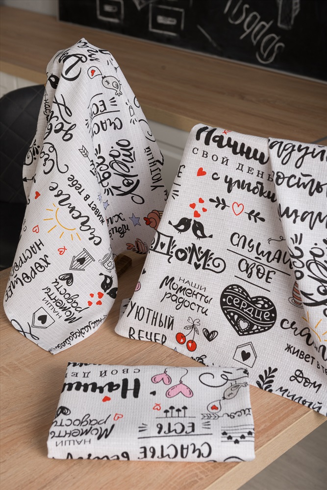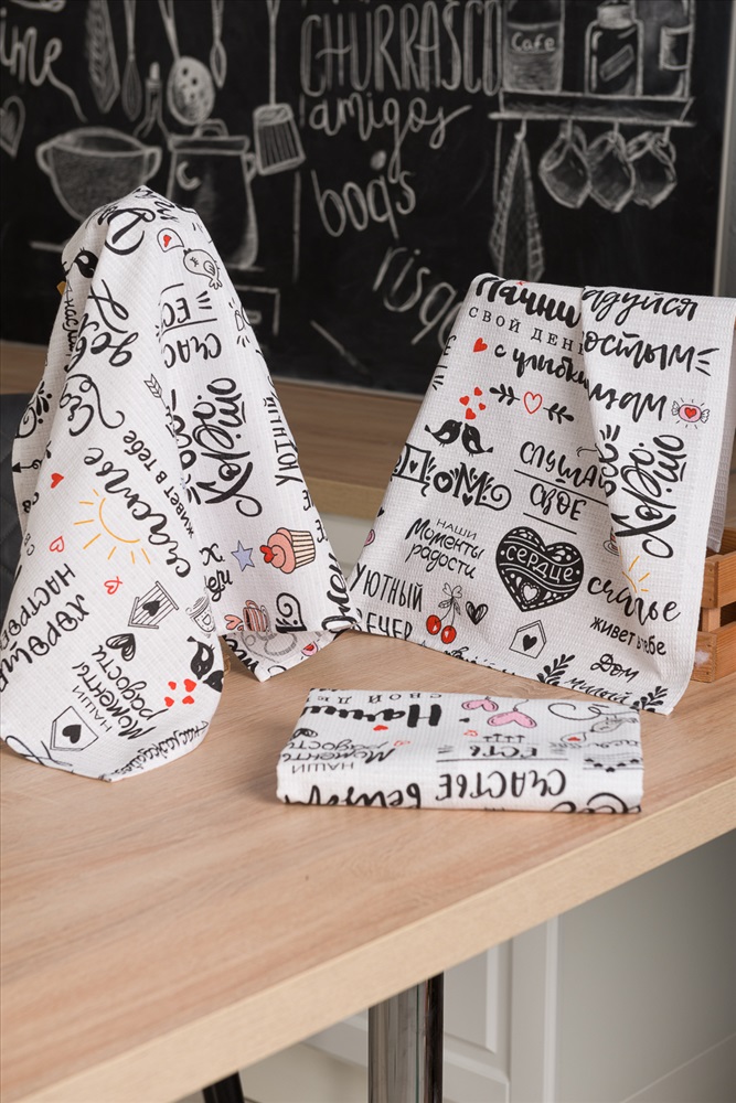 Набор из трех вафельных полотенец для кухни Мотивация размером 48*60. Белые полотенца с мотивирующими надписями помогут настроиться на нужный лад. Изделия из вафельного полотна отлично впитывают влагу, благодаря чему практичны в быту.
