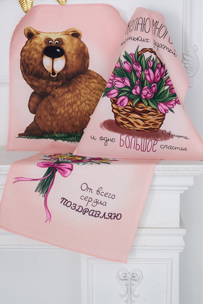 Состав: 100% хлопок Модель: Набор полотенец Сердечное поздравление Тип товара: полотенце кухонное Материал: вафельное полотно | вафельное полотно Бренд: Натали Суслова Назначение: для кухни Рисунок: надпись | цветы | зверюшки Сезонность: лето | осень | весна | зима Набор из трех вафельных полотенец Сердечное поздравление незаменим для кухни. Благодаря вафельной структуре ткани полотенца отлично впитывают влагу и идеально подходят для протирания любых поверхностей, будь то посуда, стол или руки. Полотенца с петелькой изготовлены из 100% хлопка, что обеспечивает мягкие и приятные для рук прикосновения. Кроме практичности наши полотенца обладают еще рядом преимуществ, одно из них приятный для глаз дизайн. Цветочные композиции с поздравительными надписями будут радовать владельца при использовании и украшать интерьере. К каждому полотенцу пришита петелька, размер полотенец 60*48. Таблица размеров и веса