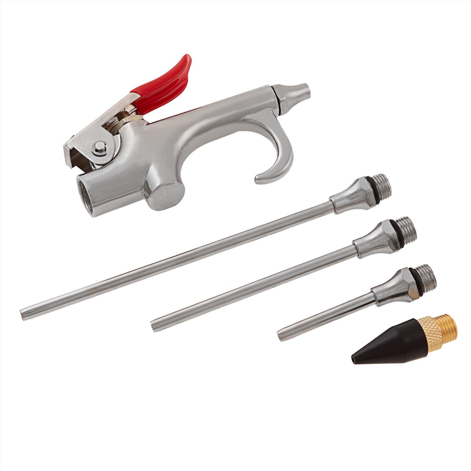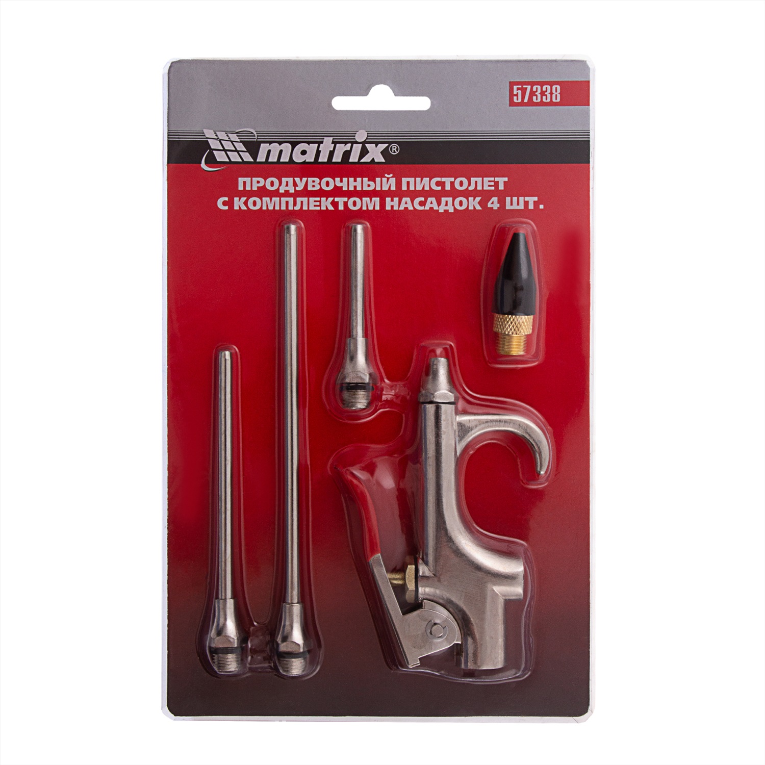 Набор продувочный Matrix 57338 включает в себя пневматический пистолет и 4 насадки-сопла для работы как с небольшими, так и глубокими отверстиями, а также для обработки больших поверхностей. Струя сжатого до 6 бар воздуха выходит со скоростью до 400 л/мин, что позволяет использовать пистолет в быту, во время ремонта и строительства, в автосервисах и небольших мастерских. Благодаря низкой пожаро- и взрывоопасности пневматический пистолет можно эксплуатировать во влажных помещениях. Преимущества