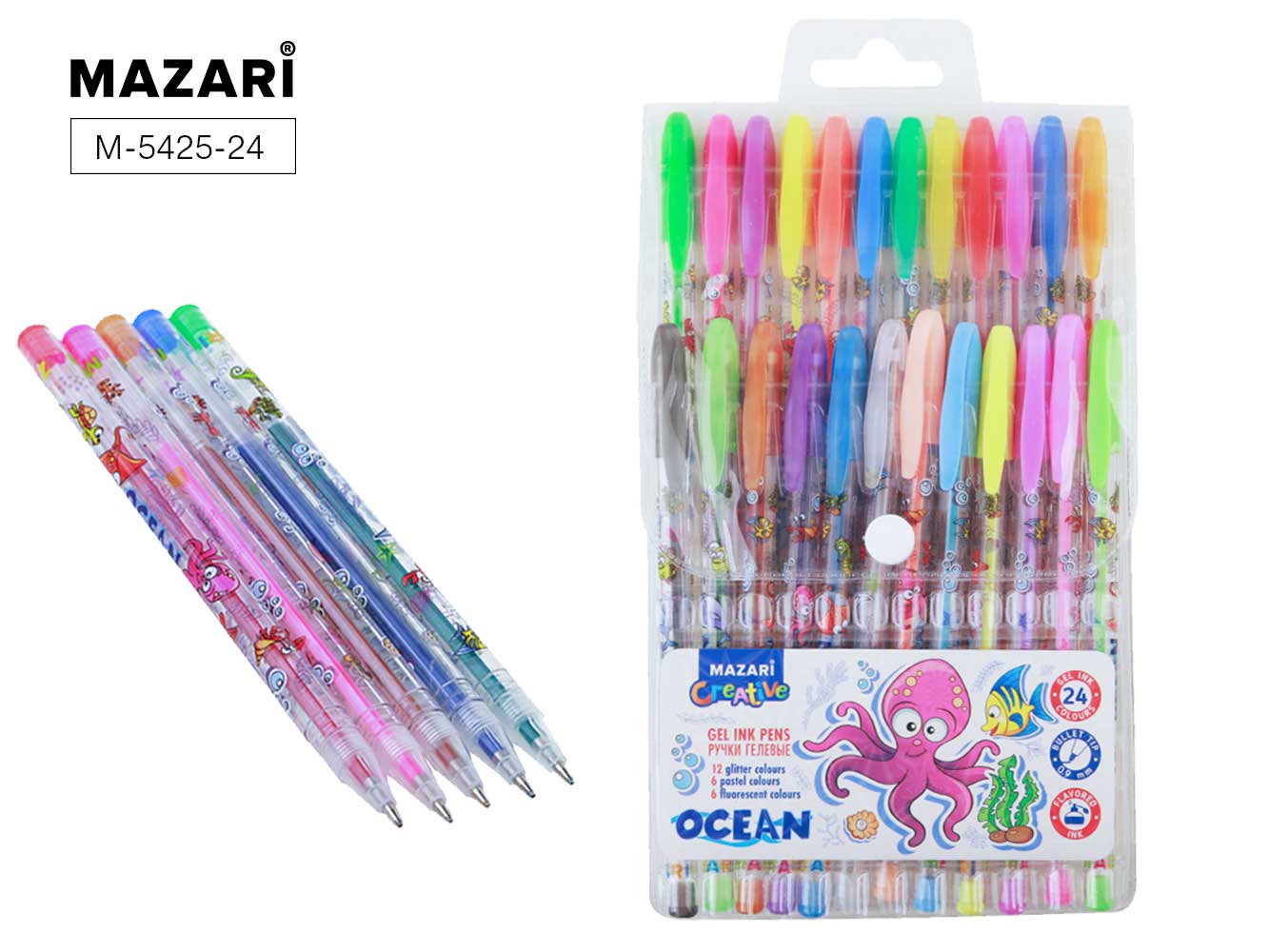 Набор ручек гелевых с блёстками OCEAN 24цв с ароматиз черн 0.9мм MAZARI M-5425-24/Китай