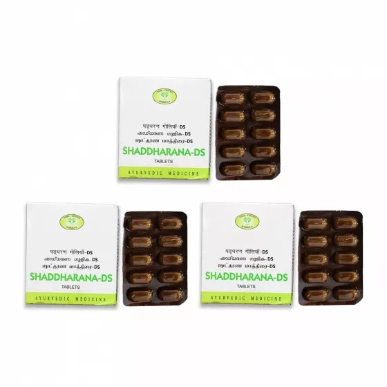 Набор Шаддхарана-ДС (Shaddharana-DS Set) - аюрведическое средство широкого спектра действия. Считается, что состав этого продукта подобран древнеиндийским медиком Сушратой. Средство показано при диабете, может снимать напряжение в нервах, суставах и мускулах, в том числе устранять судороги в бедрах. Кроме того, шаддхарана-ДС способствует умиротворению доши ваты и устранению вызванных ее дисбалансом расстройств желудка, в частности гастритов. Средство помогает при вздутии живота, метеоризме и рекомендовано для улучшения пищеварения.