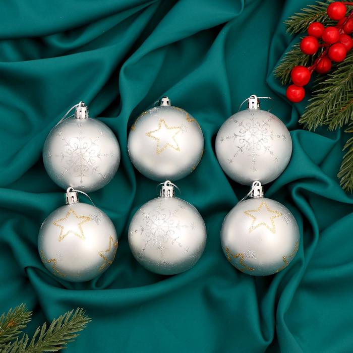 Набор из 6 серебристых шаров диаметром 6 см представляет собой сочетание стилей датского минимализма, ар-деко, скандинавской простоты и советской классики. Эти однотонные пластиковые украшения создают лаконичный и универсальный праздничный декор для новогодней ёлки.