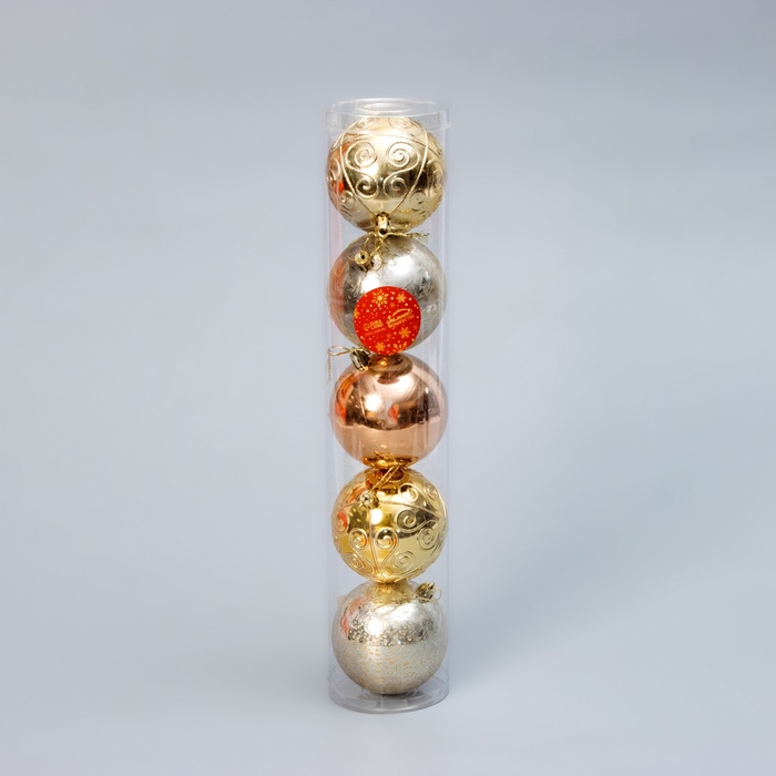 Набор из 5 золотистых шаров диаметром 8 см — классическое украшение для новогодней ёлки в стиле барокко. Однотонные шары создают спокойный и элегантный фон, подчёркивая торжественность праздничного интерьера.