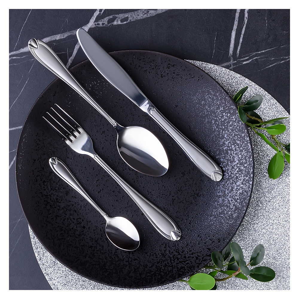 Набор состоиз из 24пр. - 6 столовых ложек, 6 столовых вилок, 6 чайных ложек, 6 столовых ножей. Набор идет в подарочном кейсе, который также подойдет для дальнейшего хранения столовый приборов.