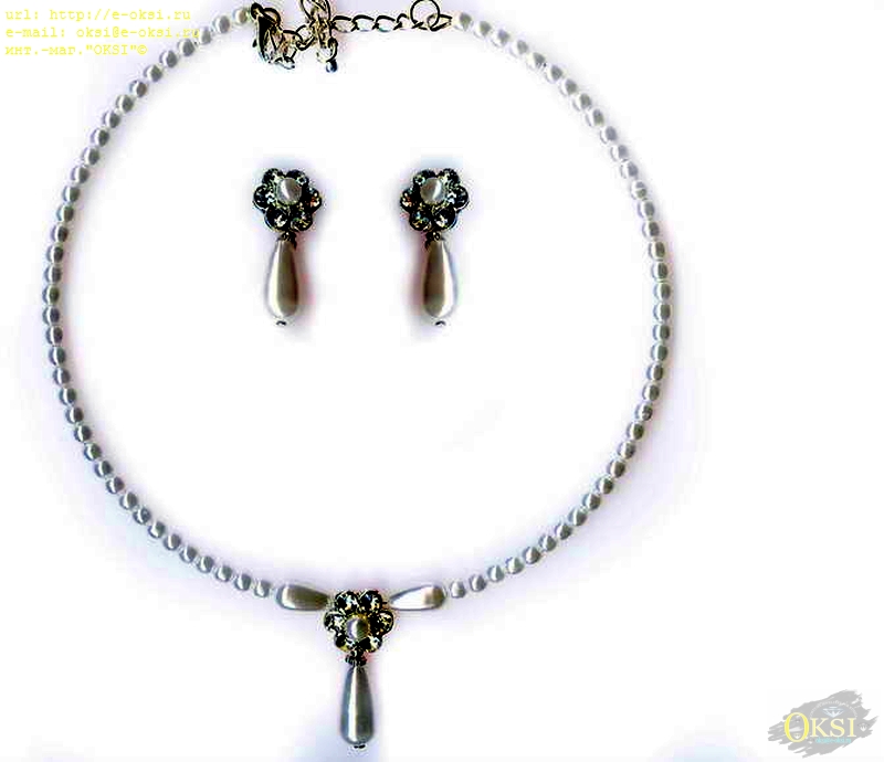 Элегантный комплект из белоснежного искусственного жемчуга и сверкающих кристаллов. Колье выполнено в виде гибкого обруча длиной 33 см + 7 см удлиняющая цепочка делающая колье безразмерным. Удобно и комфортно прилегает близко к шее. Диаметр жемчужин на колье 4 мм. Серьги размером 3,5 см х 1,3 см, гвоздики .