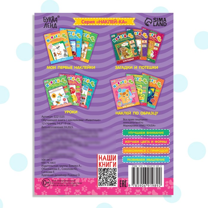 Производитель: БУКВА-ЛЕНД; Габариты: 14,5 x 0,4 x 19; Страна: Китай; В боксе: 800 шт; Состав: Бумага, бумага самоклеящаяся; Материалы: бумага, бумага самоклеящаяся; Фасовка: по 20 шт; Индивидуальная упаковка: Без упаковки; Габариты товара: 19 см × 0,2 см × 14 см; Сертификат: ЕАС; Набор: Нет; Для кого: Унисекс; Формат: А5-; Возраст: От 1 года; Количество страниц: 12; Год издания: 2023; Тематика: Животный мир; Развитие навыков: Внимание, Фигуры, цвета; Вид наклейки: Без особенностей; Тип обложки: Мягкий переплёт Обучающая книжка с наклейками познакомит малыша с животными, а также поможет развить воображение и творческие способности. Ребёнку предстоит наклеивать наклейки по образцу и дополнять изображения зверей. Книжка подойдёт для занятий с детьми от 1 года.