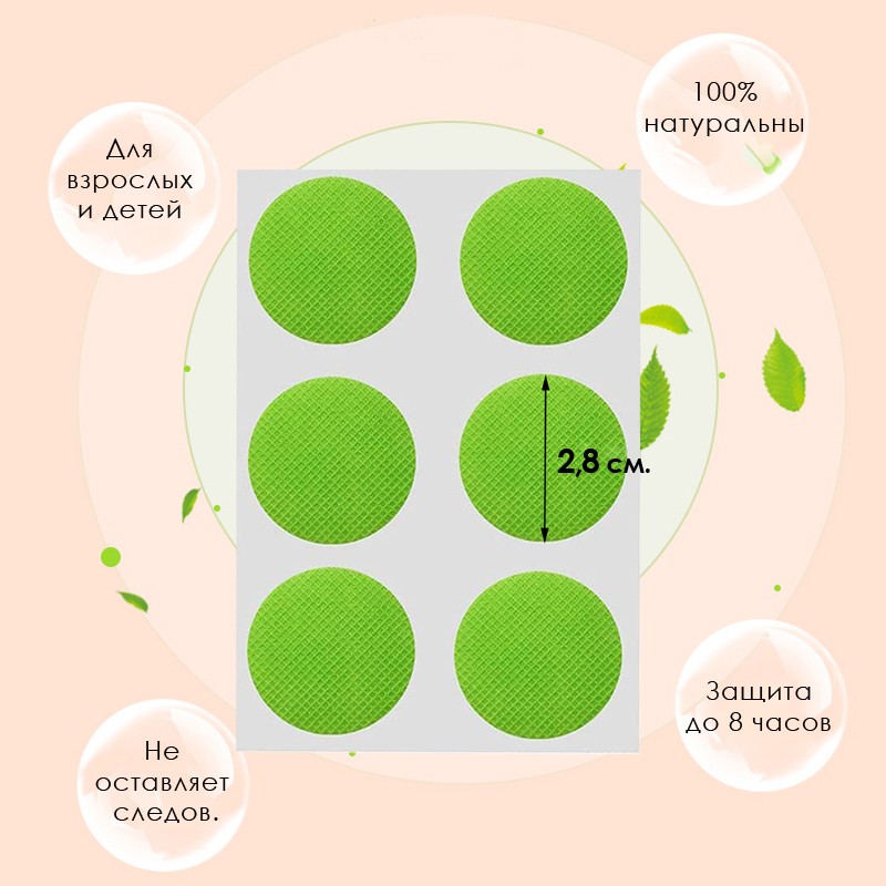 Патчи-репеллент от комаров с эфирными маслами сделаны из тонкой ткани, пропитанной веществами, отпугивающими насекомых. Подходят для взрослых и детей.