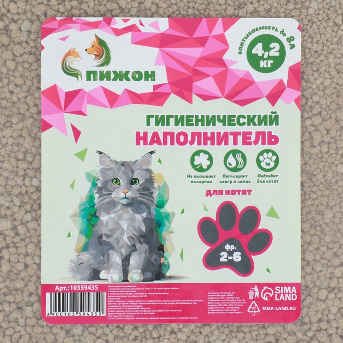 Наполнитель гигиенический "Пижон" , для котят, 4,2 кг впитываемость до 8 л фр 2-6