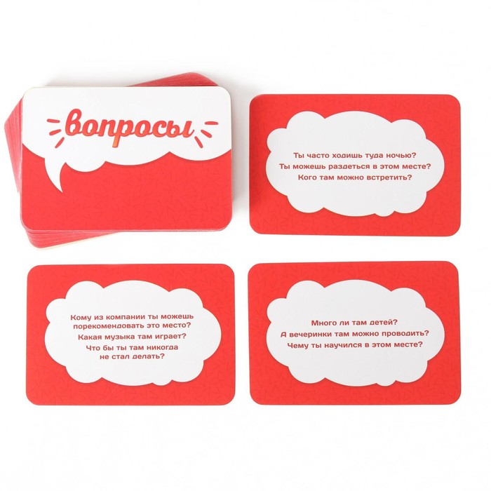 В набор входят карточки, которые нужно крепить на лоб, либо просто прислонять к нему. Содержание карты будет видно окружающим, но не участнику. Задавайте друг другу самые нелепые вопросы и отвечайте на них наугад.