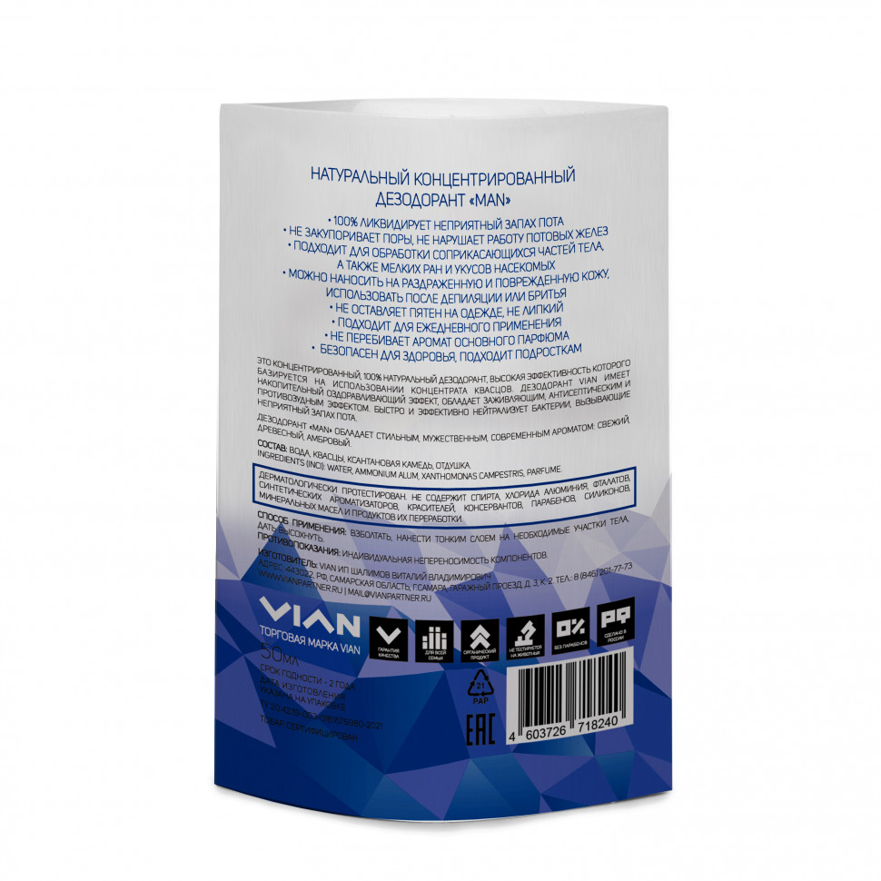 Вид: Шариковый; Срок годности: 2 года; Бренд: VIAN; Страна: Россия; Габариты: 10.3 × 6.5 × 4.2 см; Масса брутто: 83 г; Объем: 50 мл; Вариант упаковки: Единичная; Примечание: Изготовитель может вносить во внешний вид изделия изменения, которые не влияют на качество продукции.; Название вариации: Man