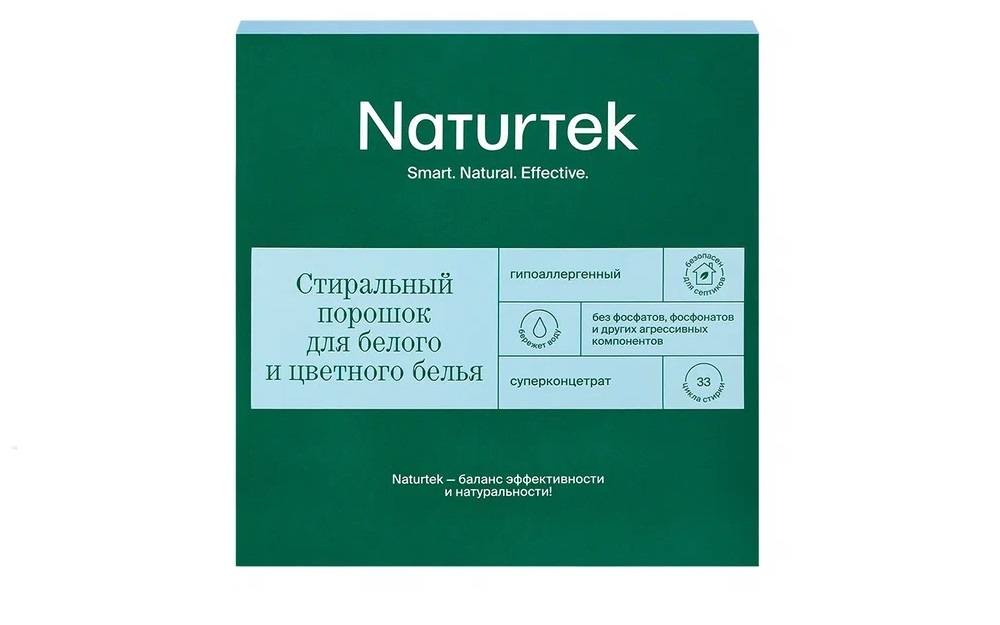 Универсальный порошок Naturtek для стирки цветного и белого белья подходит для всех видов тканей, в том числе деликатных. Оптимальный выбор для людей с чувствительной кожей: щадящая гипоаллергенная формула не содержит отдушек, а также фосфатов, фосфонатов и других агрессивных компонентов. В основе средства — натуральная мыльная стружка и комплекс энзимов, который действует направленно против трудновыводимых пятен (от фруктов, шоколада, красок и т.д.). Сбалансированный и тщательно выверенный состав порошка Naturtek позволяет эффективно удалять самые сложные загрязнения без вреда для любой ткани, даже требующей максимально бережного ухода.