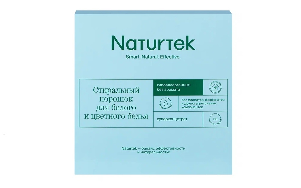 Универсальный порошок Naturtek для стирки цветного и белого белья подходит для всех видов тканей, в том числе деликатных. Оптимальный выбор для людей с чувствительной кожей: щадящая гипоаллергенная формула не содержит отдушек, а также фосфатов, фосфонатов и других агрессивных компонентов. В основе средства — натуральная мыльная стружка и комплекс энзимов, который действует направленно против трудновыводимых пятен (от фруктов, шоколада, красок и т.д.). Сбалансированный и тщательно выверенный состав порошка Naturtek позволяет эффективно удалять самые сложные загрязнения без вреда для любой ткани, даже требующей максимально бережного ухода.
