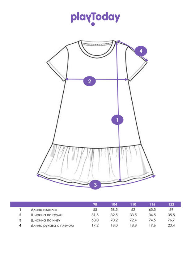 Размеры: 98, 104, 110, 116 и 122 см — подходят для девочек от 3 до 7 лет.
