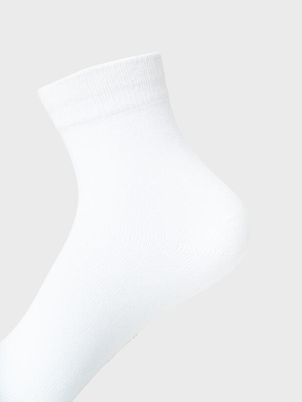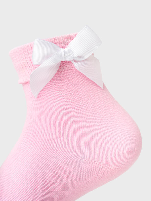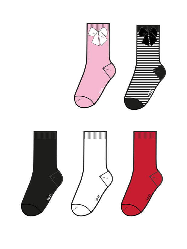 Набор детских носков для девочки. Комплект из 5 пар носков. В набор входят модели разных цветов: чёрные, белые, красные, розовые и полосатые. Две пары украшены объёмными бантиками — чёрный и белый — которые пришиты сбоку. Носки средней длины, с удобной эластичной резинкой сверху. Пятка и носок выполнены в контрастном цвете.