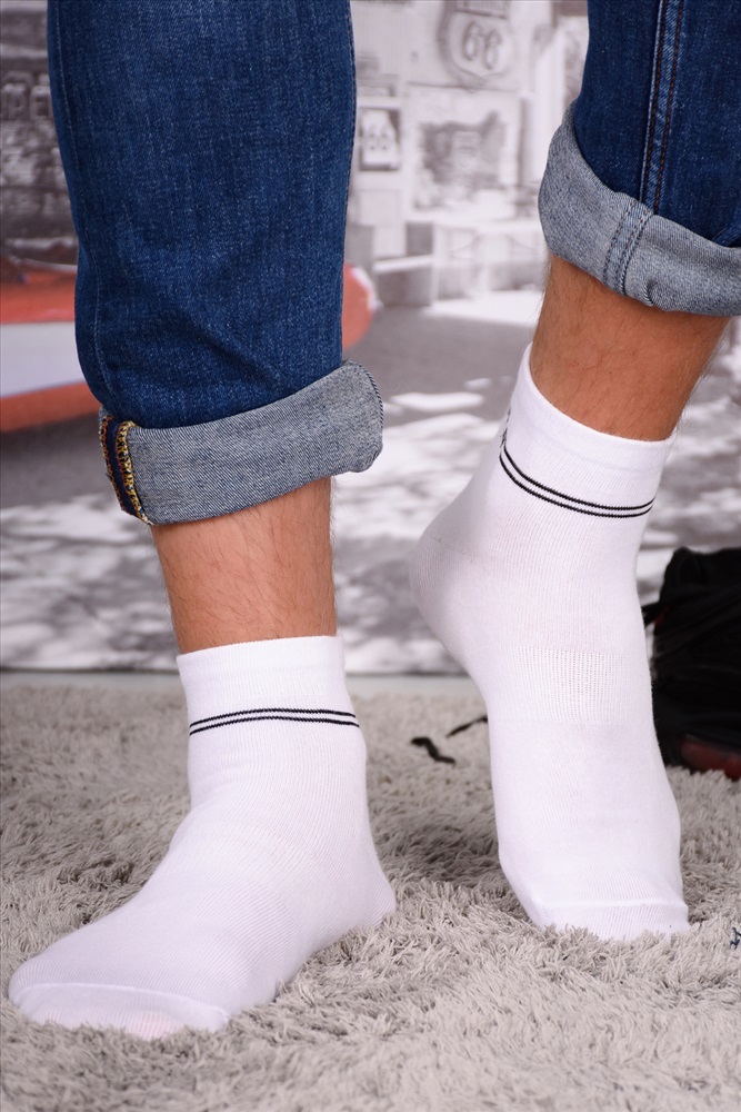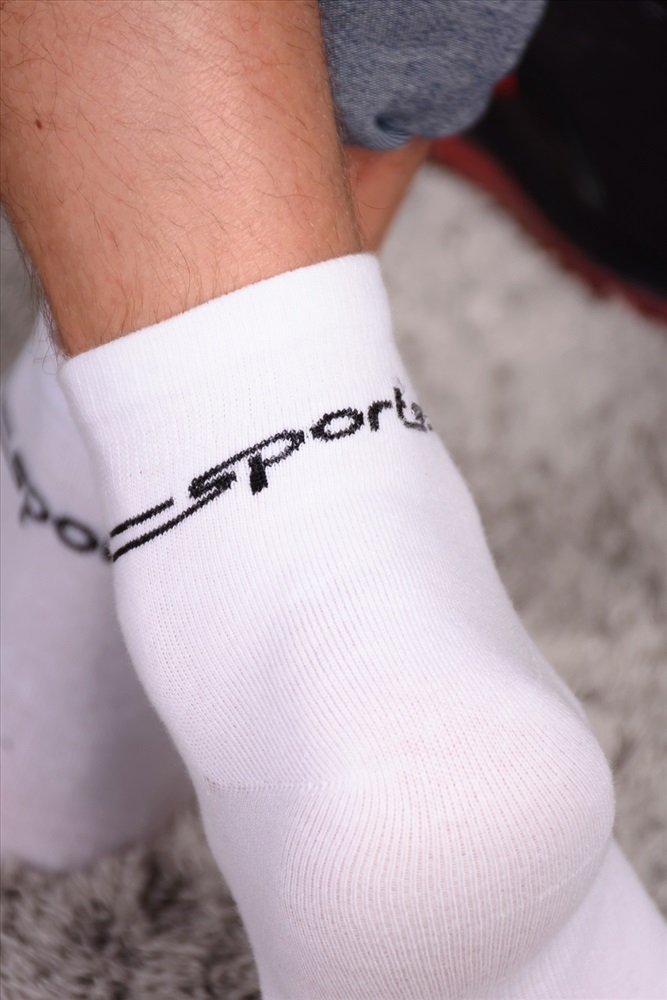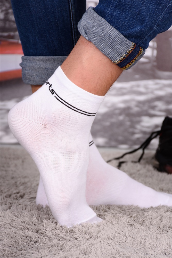 Набор спортивных мужских носков. Белые однотонные с цветными полосами вокруг паголенка и надписью Sports. В упаковке 6 пар