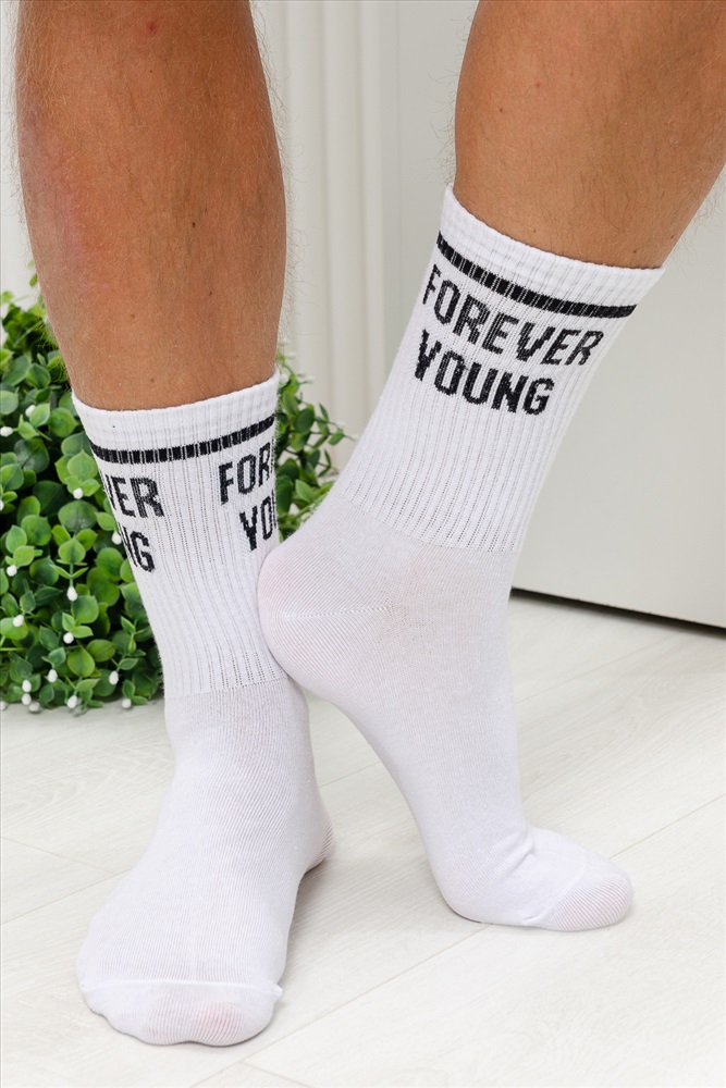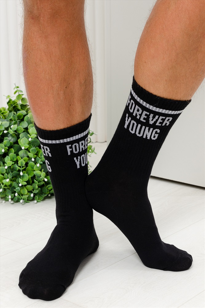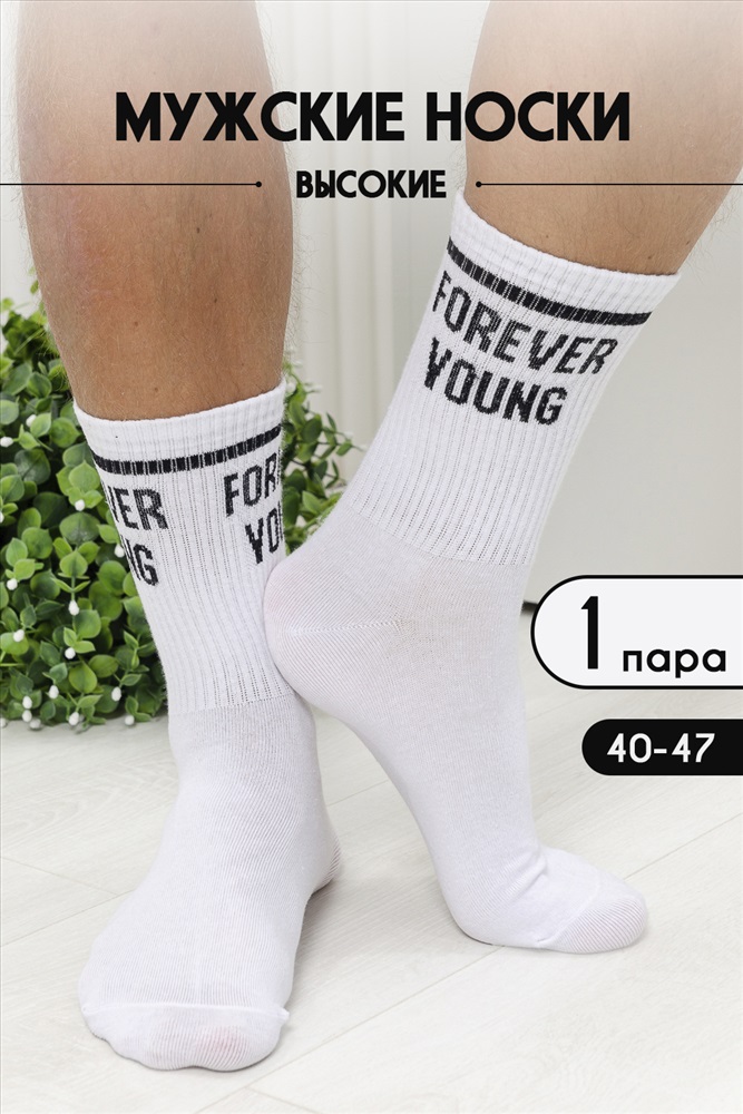 Стильные мужские носки с высокой резинкой и надписью. Высокий паголенок, широкая резинка, прекрасно подходят для занятий спортом и повседневной носки, а также в качестве сувенира по любому поводу. В комплекте 1 пара черного или белого цвета на выбор.