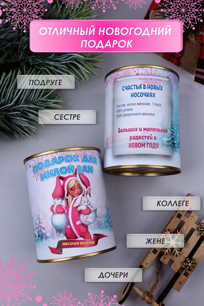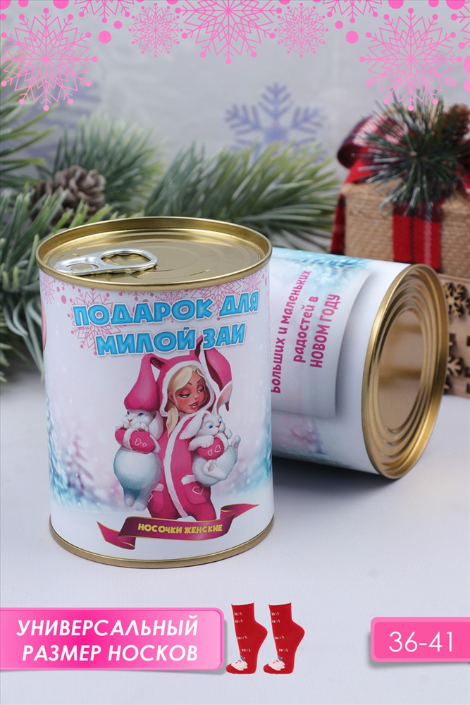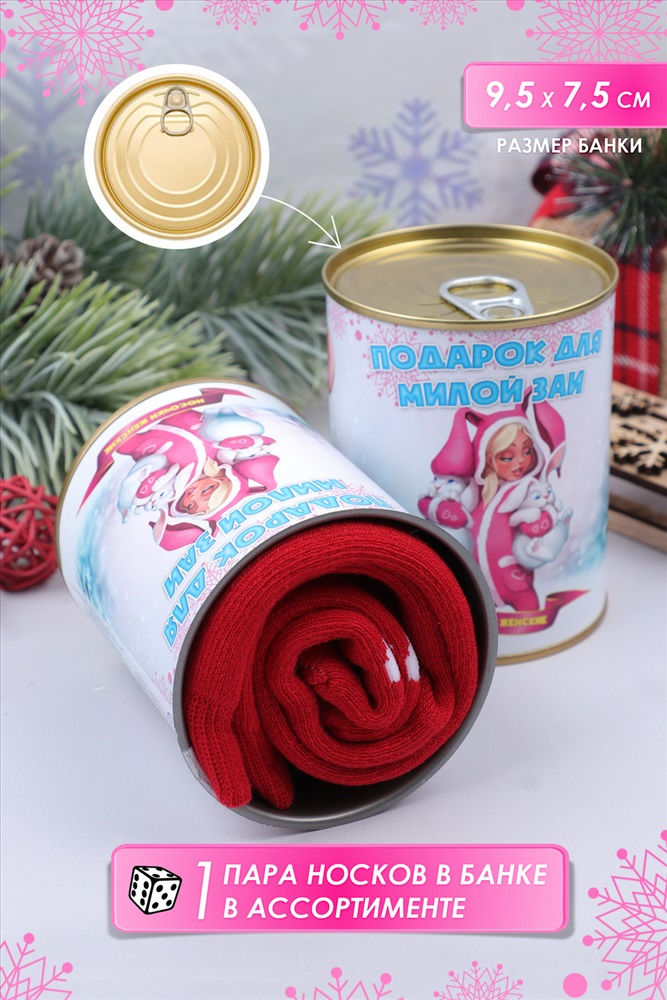 Женские махровые носки с новогодним принтом в консервной банке с забавной этикеткой - отличный подарок на Новый Год. Этот сувенир не останется без внимания, ведь подарки должны радовать, вызывать улыбку, и быть уютными! Внутри банки вы найдете одну пару носочков состав которых: 85% хлопок, 10% полиамид, 5% спандекс; размер: 36-41; новогодние расцветки в ассортименте.