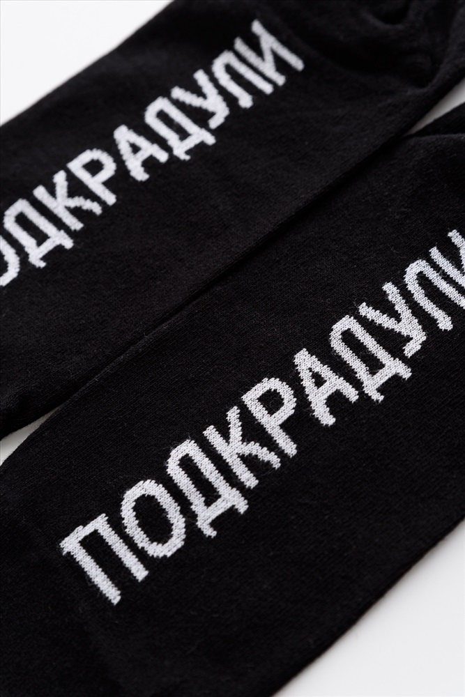 Мужские носки в комплекте 1 пара. Широкая резинка по всей верхней части носка. Надпись на стопе Подкрадули