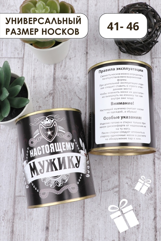 Носки в консервной банке - отличное решение для подарка мужчине на любой случай. Внутри банки носки мужские 1 пара, состав 80% хлопок, 15% полиамид, 5% лайкра, универсального размера 41-46. Использование высококачественного материала позволяет коже дышать, а добавление небольшого количества синтетических нитей делает носки долговечней.