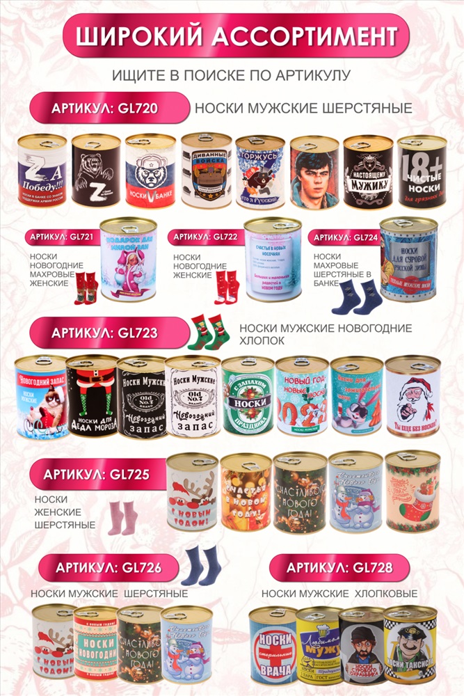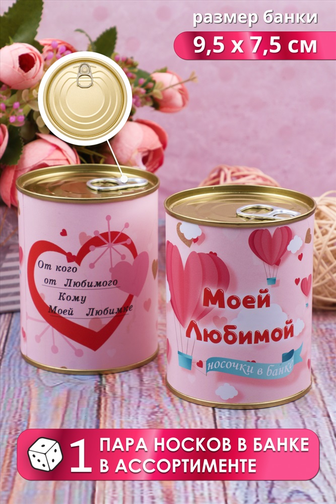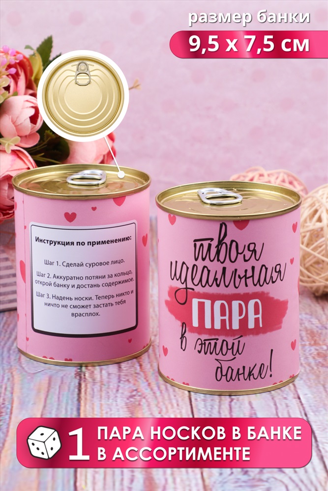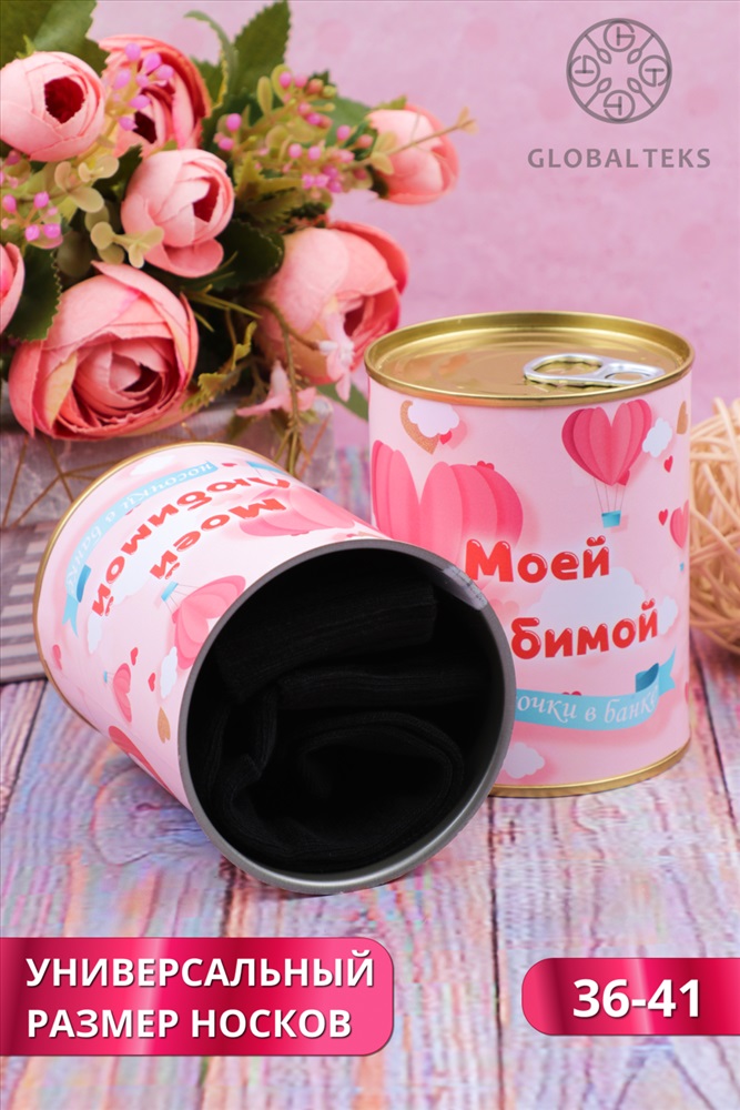 Производитель: Глобал Текс; Состав: 80% хлопок, 15% полиамид, 5% эластан; Модель: Носки женские GL730 в банке; Тип товара: носки высокие; Материал: чулочно-носочный трикотаж | чулочно-носочный трикотаж; Бренд: Глобал Текс; Рейтинг: Рейтинг 4 и выше; Рисунок: однотонные | полоска; Сезонность: лето | осень | весна | зима; Стиль: повседневный Искать подарок женщине - настоящий стресс для мужчины. Носки в банке это идеальный подарок с юмором для любимой, мамы или подруги. Носочки созданы специально для подарка на 8 марта, 14 февраля, день рождения или просто порадовать. Этот сувенир не останется без внимания, ведь подарки должны радовать, вызывать улыбку, и быть уютными! Герметично упакованные в банку женские носки мягкие, максимально хлопковые и прочные, поразят свою избранницу. Носки в подарочной упаковке всегда пригодятся, благодаря интересному дизайну их можно использовать как подарки коллегам. А еще носки внутри банки отличного качества! Носки женские отличный уже упакованный подарок для подруг, близких и родных, который не требует от вас дополнительной изобретательности! В банке одна пара цветных носков. Цвет носков сюрприз! Внутри банки носки женские 1 пара, состав 80% хлопок, 15% полиамид, 5% эластан, универсального размера 36-41. Использование высококачественного материала позволяет коже дышать, а добавление небольшого количества синтетических нитей делает носки долговечней. Диз.1 Моей любимой Диз.2 Твоя идеальная пара Диз.3 Для модницы Диз.4 Детка ты Космос Диз.5 Для мамочки Диз.6 Крутой бабуле Диз.7 Стильной штучке Диз.8 Для Бабушки Диз.9 Для мамы Диз.10 Свекрови Цвет носков внутри банки в ассортименте. Таблица размеров и веса Вес (гр.): 90 (36-41) Замеры и вес изделий могут незначительно отличаться
