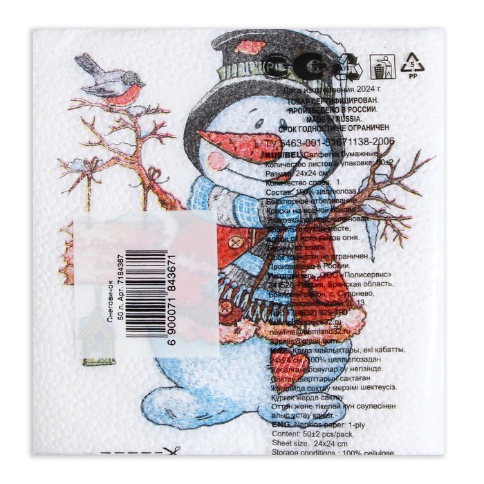 Габариты: 12 x 12 x 6 Доставка: Платная Страна: Россия В боксе: 60 набор В наборе: 50 набор Состав: Целлюлоза Материалы: целлюлоза Фасовка: по 1 набор Индивидуальная упаковка: Пакет Сертификат: СТР Набор: Нет Цвет: Разноцветный Размер, см: 24 х 24 В наборе, шт.: 50 Фасовка, шт.: 50 Тематика: Новогодняя Вид упаковки: Пакет Рисунок: Да Символ года: Нет Тематика праздника: Новый год Материал: Бумага Тип бумаги: Однослойная Вид: С рисунком Новогодние сервировочные бумажные салфетки бренда Гармония цвета с рисунком "Снеговичок" - это отличное украшение для вашего праздничного новогоднего стола. Идеально подойдут как для сервировки, так и в качестве декора и украшения как в домашних условиях, так и на больших праздничных мероприятиях. Салфетки с уникальным рисунком будут хорошим подарком для родных и близких. Данные салфетки можно использовать так же для декупажа и коллажей. Состав 100% целлюлоза. Размер салфетки в развёрнутом виде 24х24 см. в сложенном виде 12х12 см. Комментарии к товару