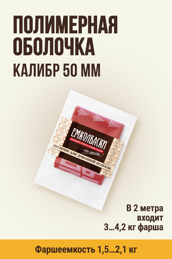 Производитель: ИП Агапкин ПА; Вид оболочки: мембранная полимерная оболочка.; Материал: полимерная мембранная пленка.; Количество в упаковке: 2 метра.; Калибр оболочки: 50 мм.; Фаршеемкость: в 1 м - 1,5...2,1 кг. В 2 метрах этой оболочки поместится от 3 до 4,2 кг фарша.; Цвет: красный с нанесенным рисунком.; Виды колбас: варено-копченая колбаса, копчено-вареная колбаса, вареная колбаса.; Способ приготовления: варка, копчение, запекание.; Температурный режим приготовления: не выше 85 град.; Подготовка к набивке: перед использованием оболочку следует замочить на 5-10 минут в теплой воде.; Условия и сроки хранения: хранить при t = 15…25 град. и отн.влажности 65…75% - 36 мес.