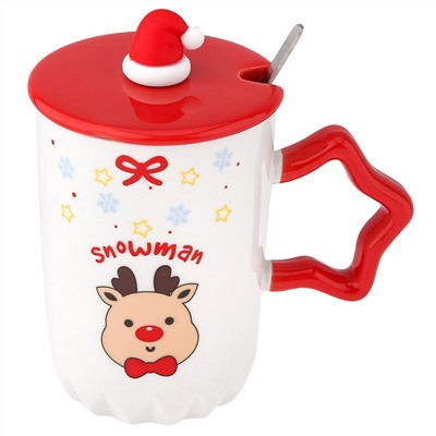 "Новый год" Кружка фарфоровая "Звезда" "Олень" 350мл, д7,9см h10,9см, глянцевая глазурь, с деколью, цвет - белый, фарфоровая крышка с декором, ложка нерж. 14,4см, д/горла 7,3см, д/основания 6см, в подарочной коробке (Китай)
