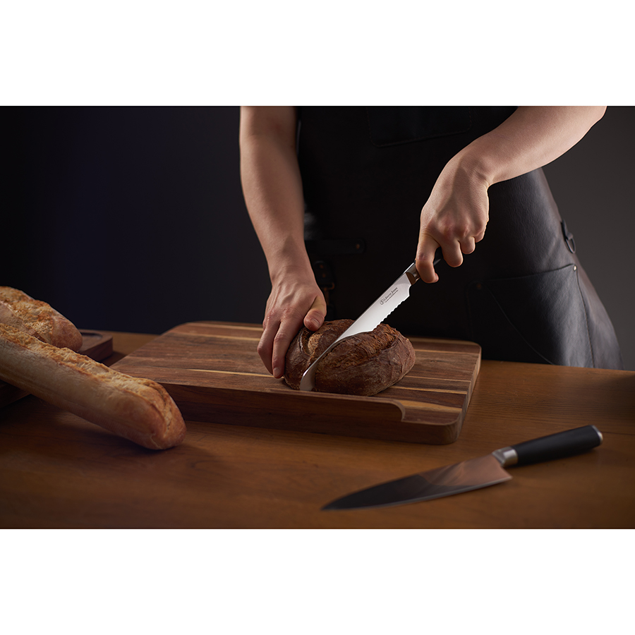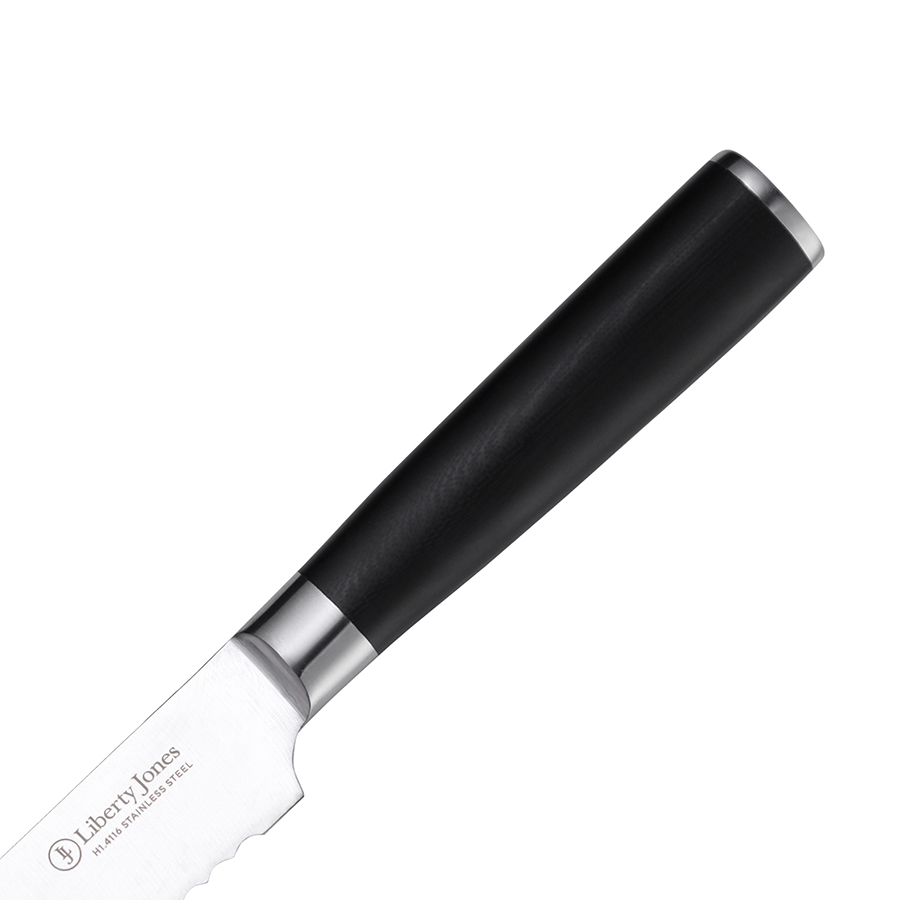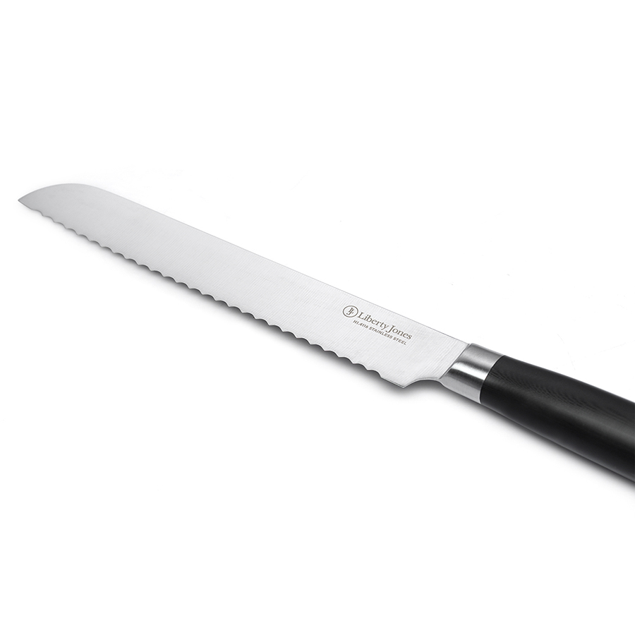 Нож Icon от бренда Liberty Jones идеально подходит для аккуратного нарезания любых видов хлеба, от хрустящих багетов до мягких булочек. Клинок из известной своими свойствами немецкой нержавеющей стали гарантирует кухонному инструменту долговечность и безупречную остроту, а ручка из композитного материала обеспечивает комфорт и безопасность в использовании. Лазерные системы контролируют угол заточки с точностью до 0,1°, что невозможно при ручной или механической обработке. Кроме того, лазерная заточка не перегревает металл (в отличие от ручных методов), сохраняя структуру стали.