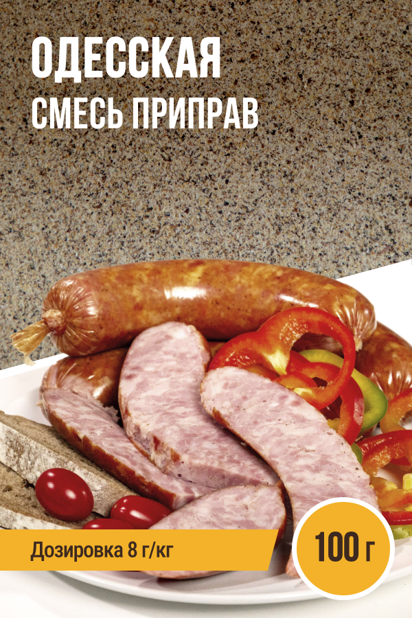 Производитель: ИП Агапкин ПА; Состав: чеснок молотый, мускатный орех, перцы и их экстракты, глюкоза.; Норма внесения: 8 г на 1 кг мясного сырья.; Подходит для: одесской колбасы, варено-копченой колбасы, копчено-вареной колбасы, сервелата, рулета.; Количество в упаковке: 100 г.; Условия и сроки хранения: 24 месяца при комнатной температуре и относительной влажности воздуха 20...75% в герметичной упаковке.
