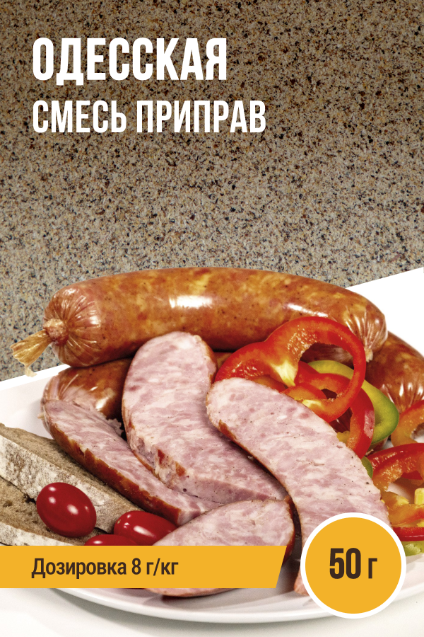 Производитель: ИП Агапкин ПА; Состав: чеснок молотый, мускатный орех, перцы и их экстракты, глюкоза.; Норма внесения: 8 г на 1 кг мясного сырья.; Подходит для: одесской колбасы, варено-копченой колбасы, копчено-вареной колбасы, сервелата, рулета.; Количество в упаковке: 50 г.; Условия и сроки хранения: 24 месяца при комнатной температуре и относительной влажности воздуха 20...75% в герметичной упаковке.