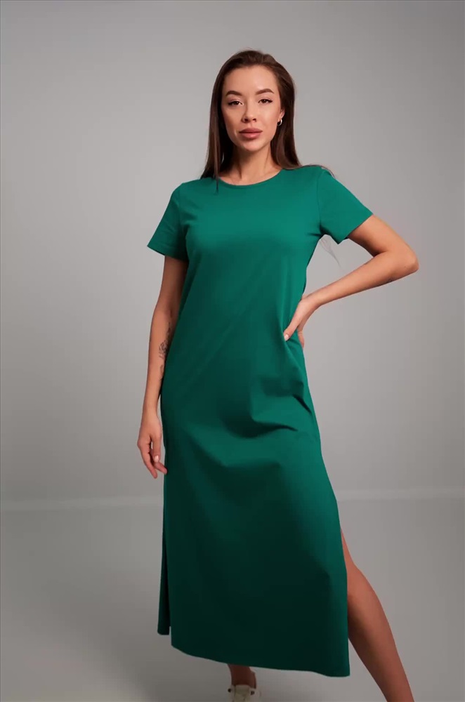 Однотонное зеленое платье – универсальная база на каждый день. Благодаря длине миди и удобным разрезам летнее платье дарит свободу движений. Изумрудное платье станет стильным акцентом. Трикотажное платье подходит для прогулок летом.
