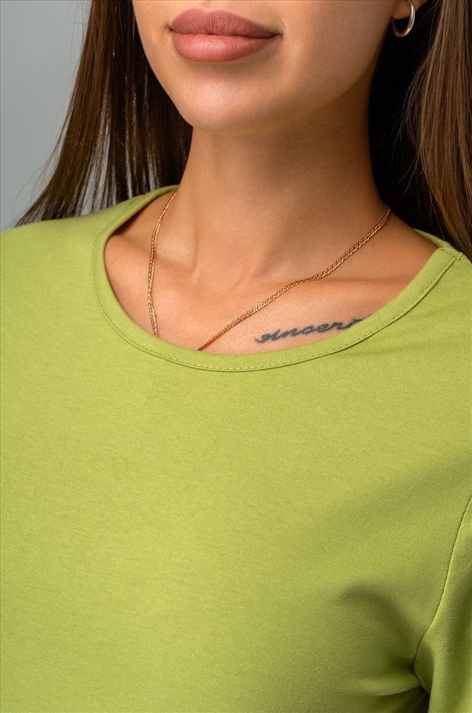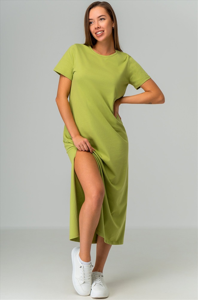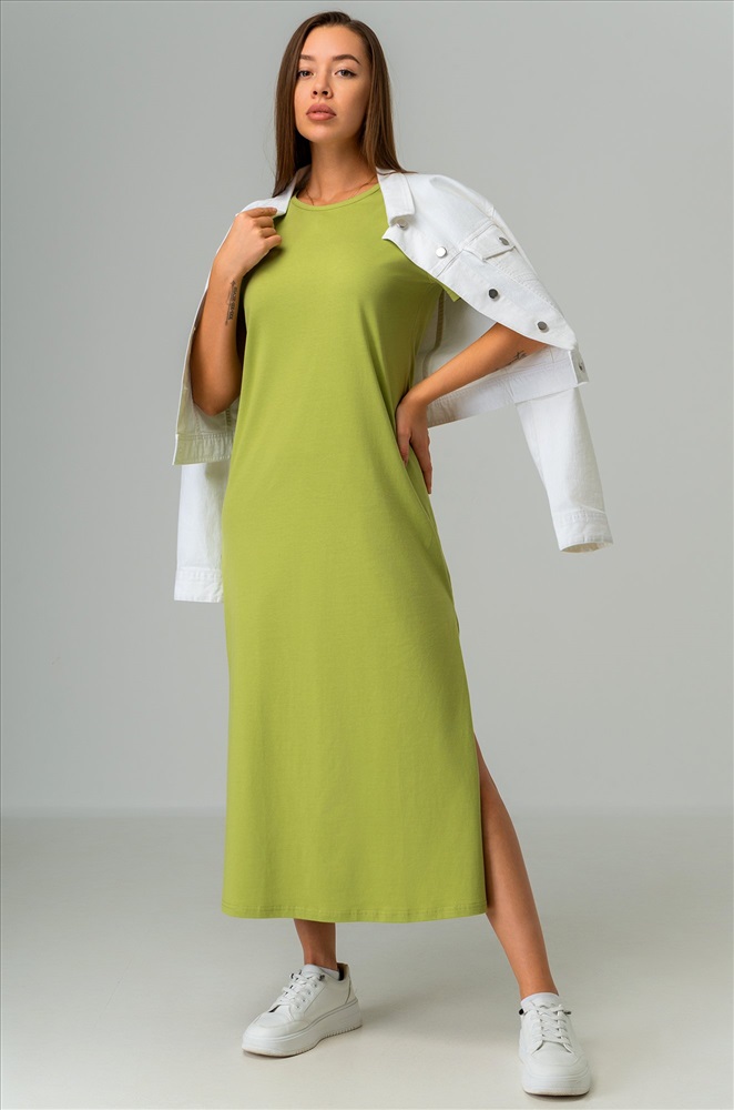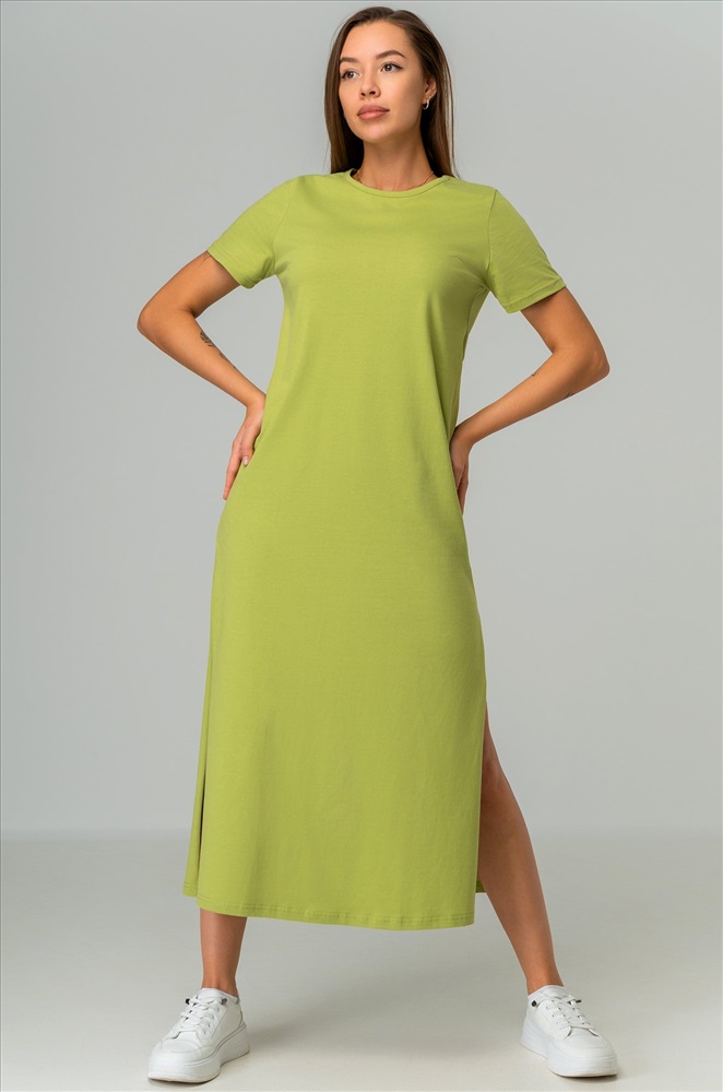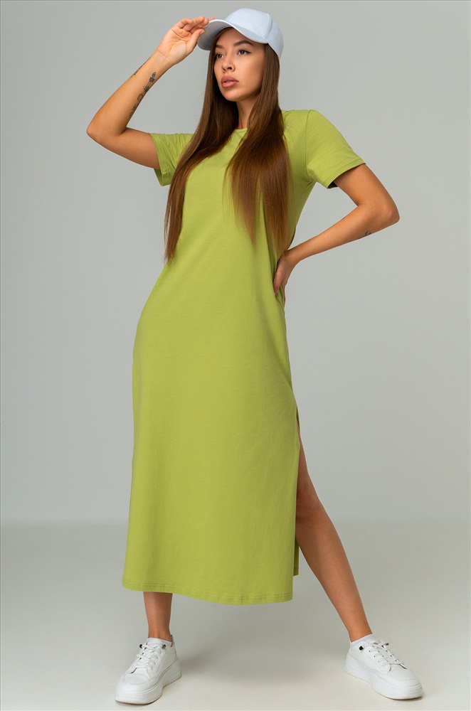 Однотонное зеленое платье – универсальная база на каждый день. Благодаря длине миди и удобным разрезам летнее платье дарит свободу движений. Трикотажное платье подходит для прогулок летом.