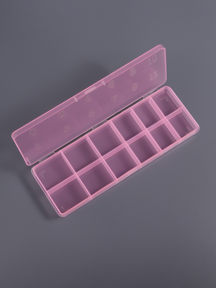 Органайзер выполнен из прочного прозрачного пластика с розовыми акцентами и имеет 12 секций, каждая из которых закрывается надежной крышкой. Это позволяет хранить декоративные элементы в идеальном состоянии, защищая их от пыли и повреждений.